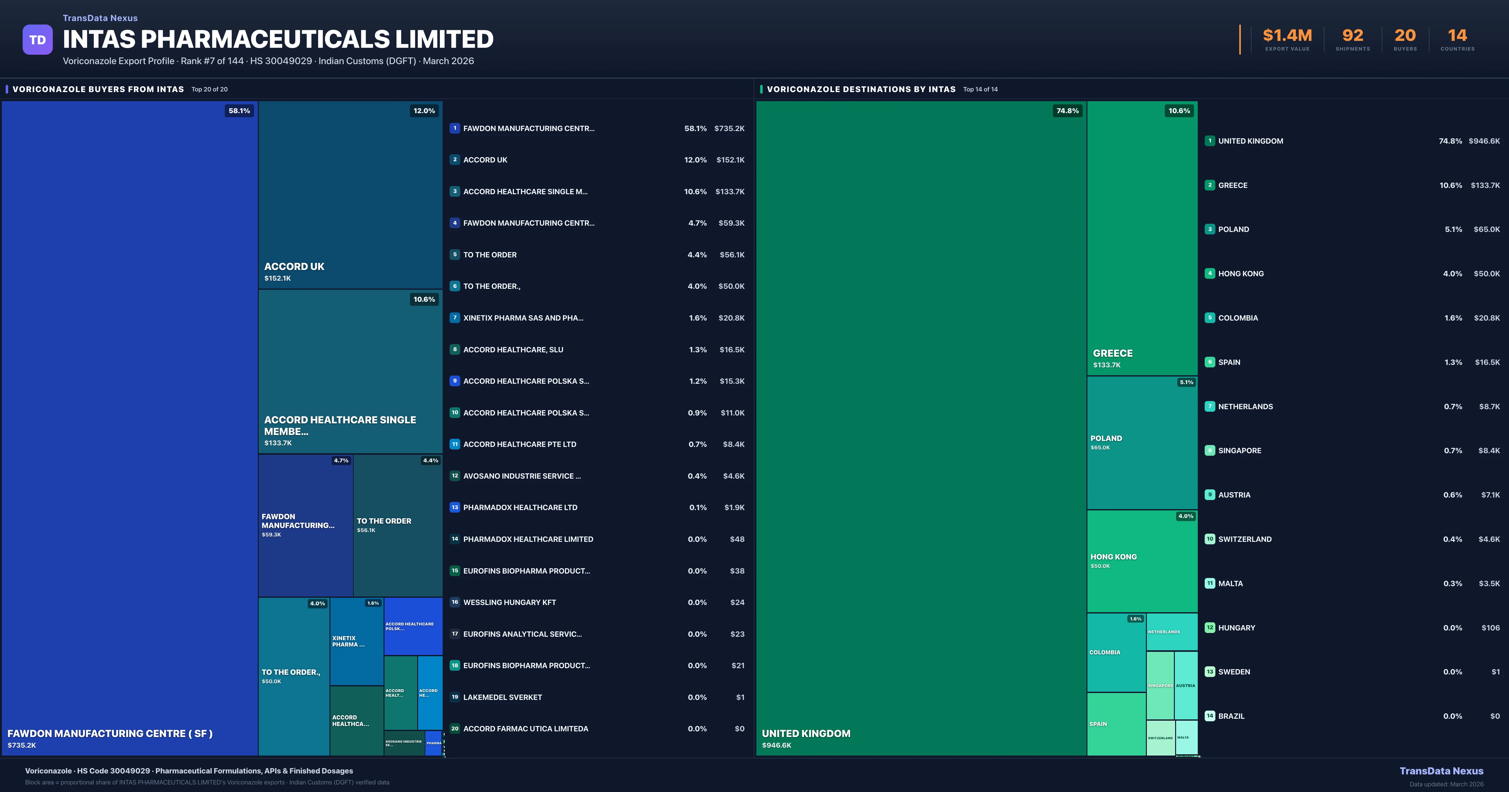 Intas Pharmaceuticals Limited supplies Voriconazole to 20 buyers globally. The largest buyer is FAWDON MANUFACTURING CENTRE ( SF ) (UNITED KINGDOM), followed by ACCORD UK (UNITED KINGDOM) and ACCORD HEALTHCARE SINGLE MEMBER SA (GREECE). These buyers represent pharmaceutical distributors, hospital groups, and government procurement agencies in their respective markets.