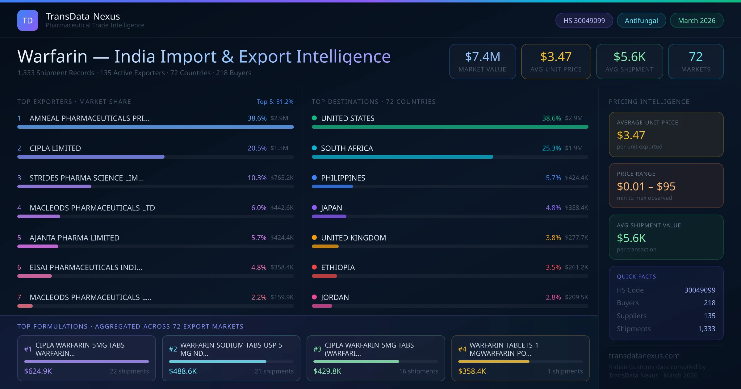The total export value of warfarin from India is $7.4M, recorded across 1,333 shipments from 135 active exporters to 72 countries. The average shipment value is $5.6K.