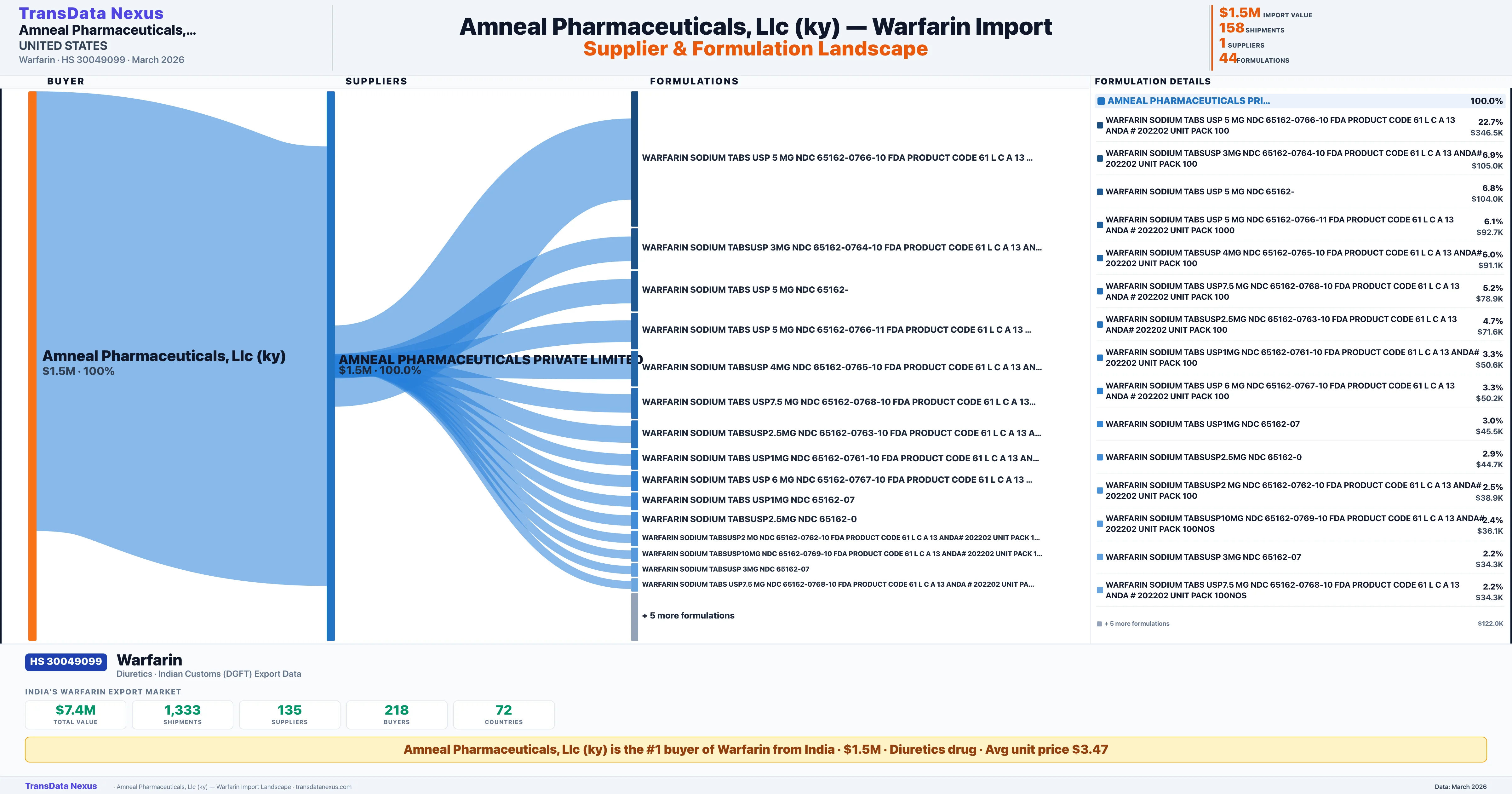 AMNEAL PHARMACEUTICALS, LLC (KY) sources Warfarin from 1 verified Indian supplier based on 158 customs records. The primary supplier is AMNEAL PHARMACEUTICALS PRIVATE LIMITED accounting for 100.0% of imports.