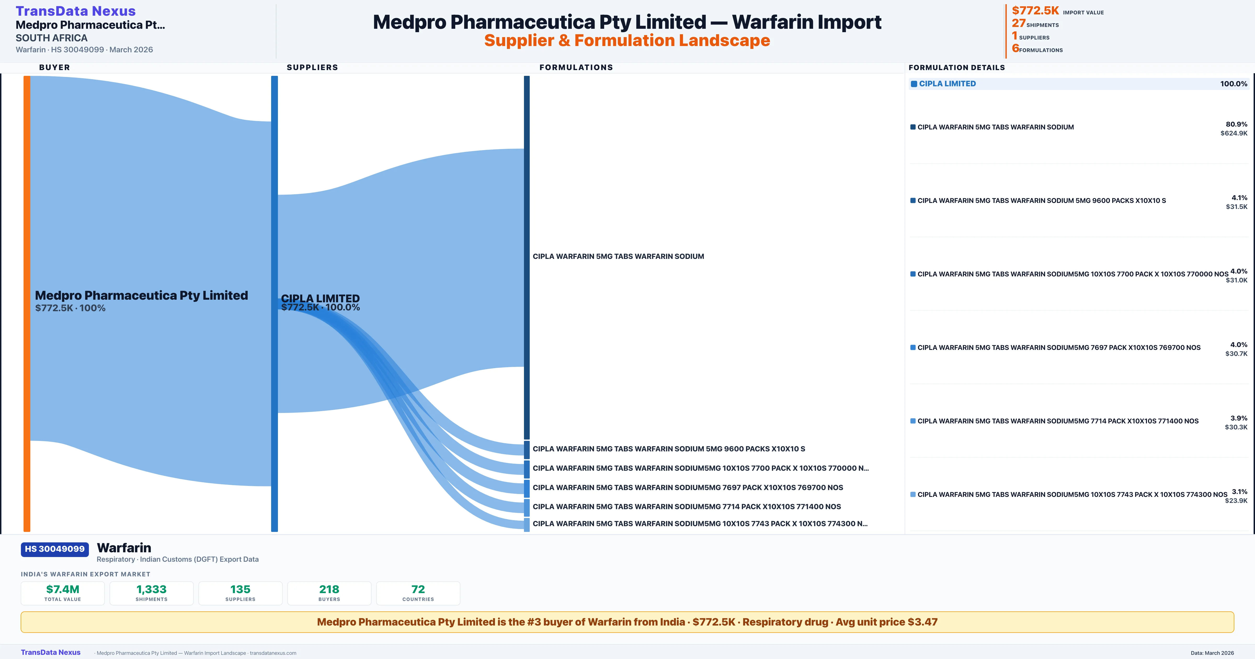 MEDPRO PHARMACEUTICA PTY LIMITED sources Warfarin from 1 verified Indian supplier: CIPLA LIMITED ($772.5K, 100.0%). This is based on 27 customs records.