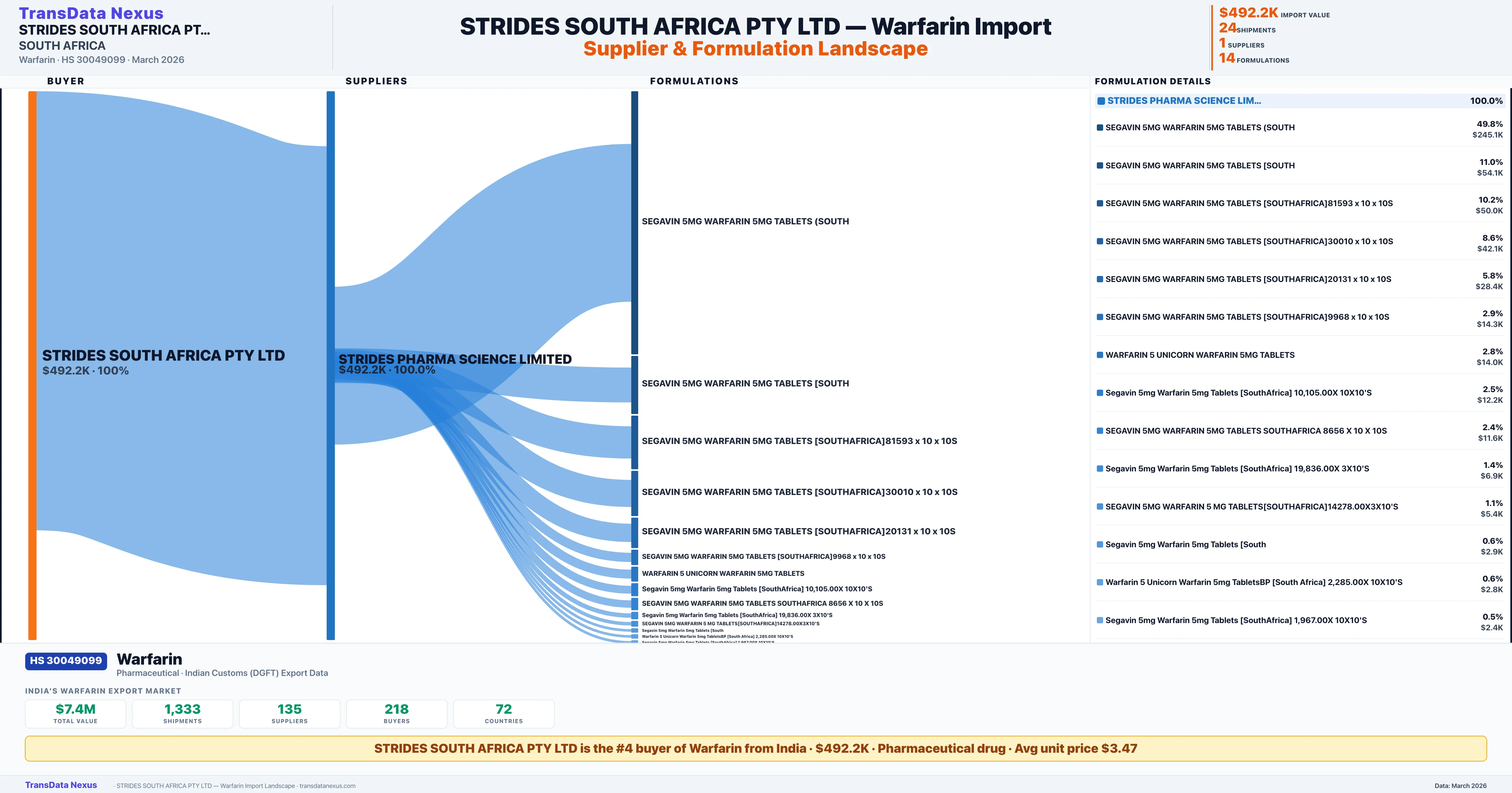 STRIDES SOUTH AFRICA PTY LTD sources Warfarin from 1 verified Indian supplier: STRIDES PHARMA SCIENCE LIMITED ($492.2K, 100.0%). This is based on 24 customs records.