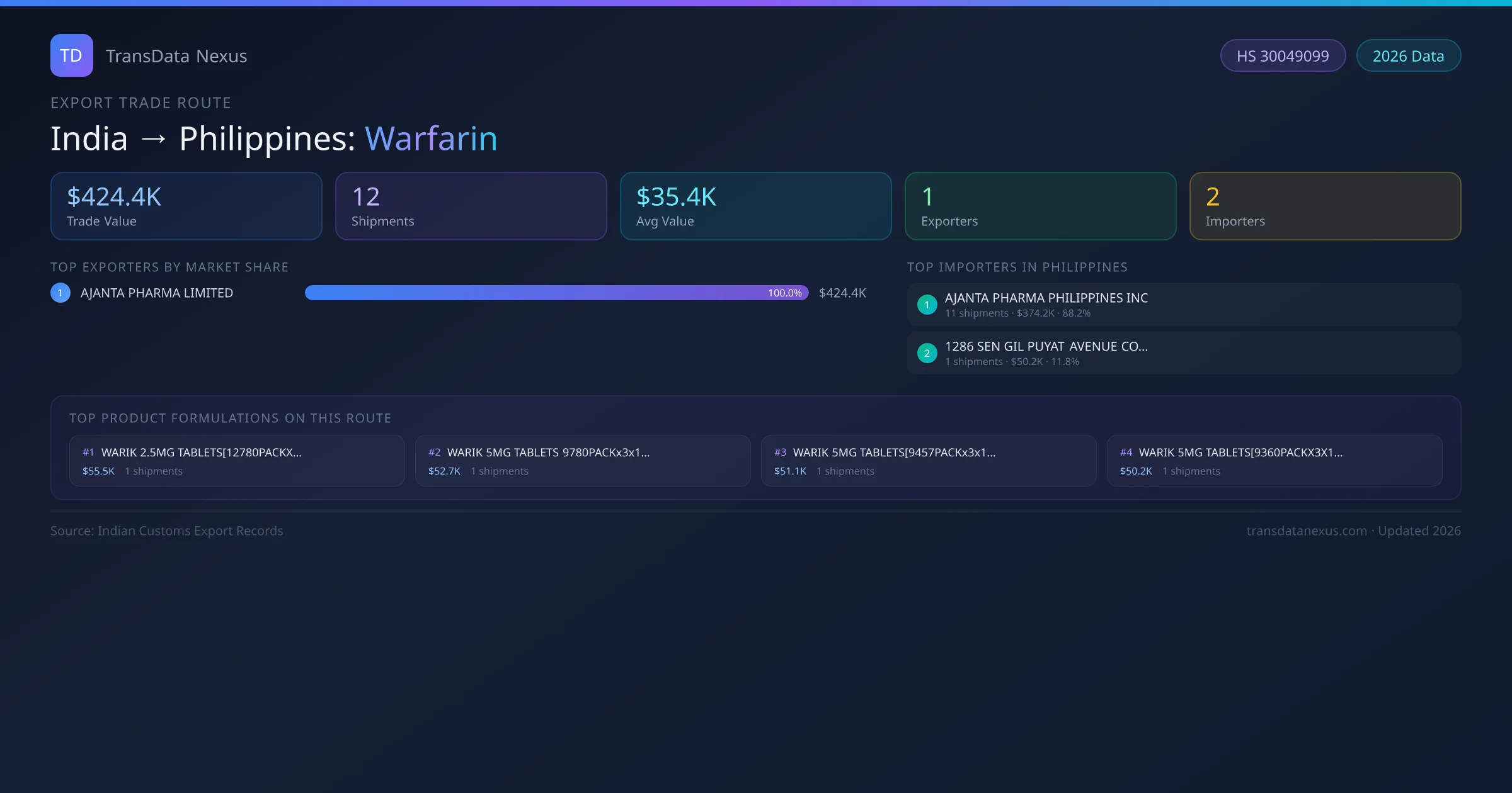The India to Philippines Warfarin corridor is one of India's established pharmaceutical export routes, with 12 shipments documented worth a combined $424.4K USD. The route is dominated by AJANTA PHARMA LIMITED, which alone accounts for roughly 100% of all export value, reflecting the consolidated nature of India's warfarin manufacturing sector.