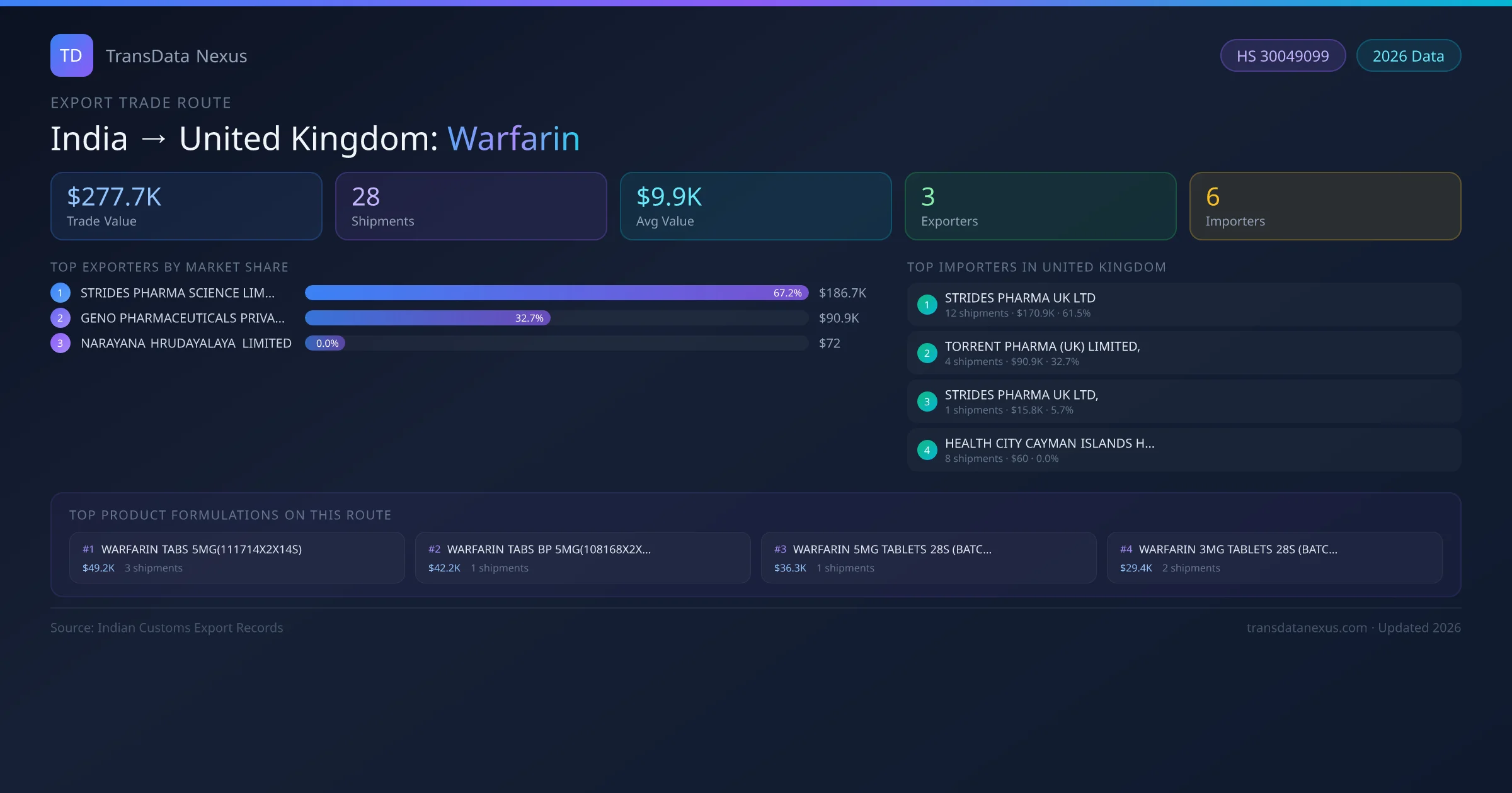 - 1.Route Identification: India to United Kingdom export trade corridor identified from Indian Customs (DGFT) records for Warfarin.