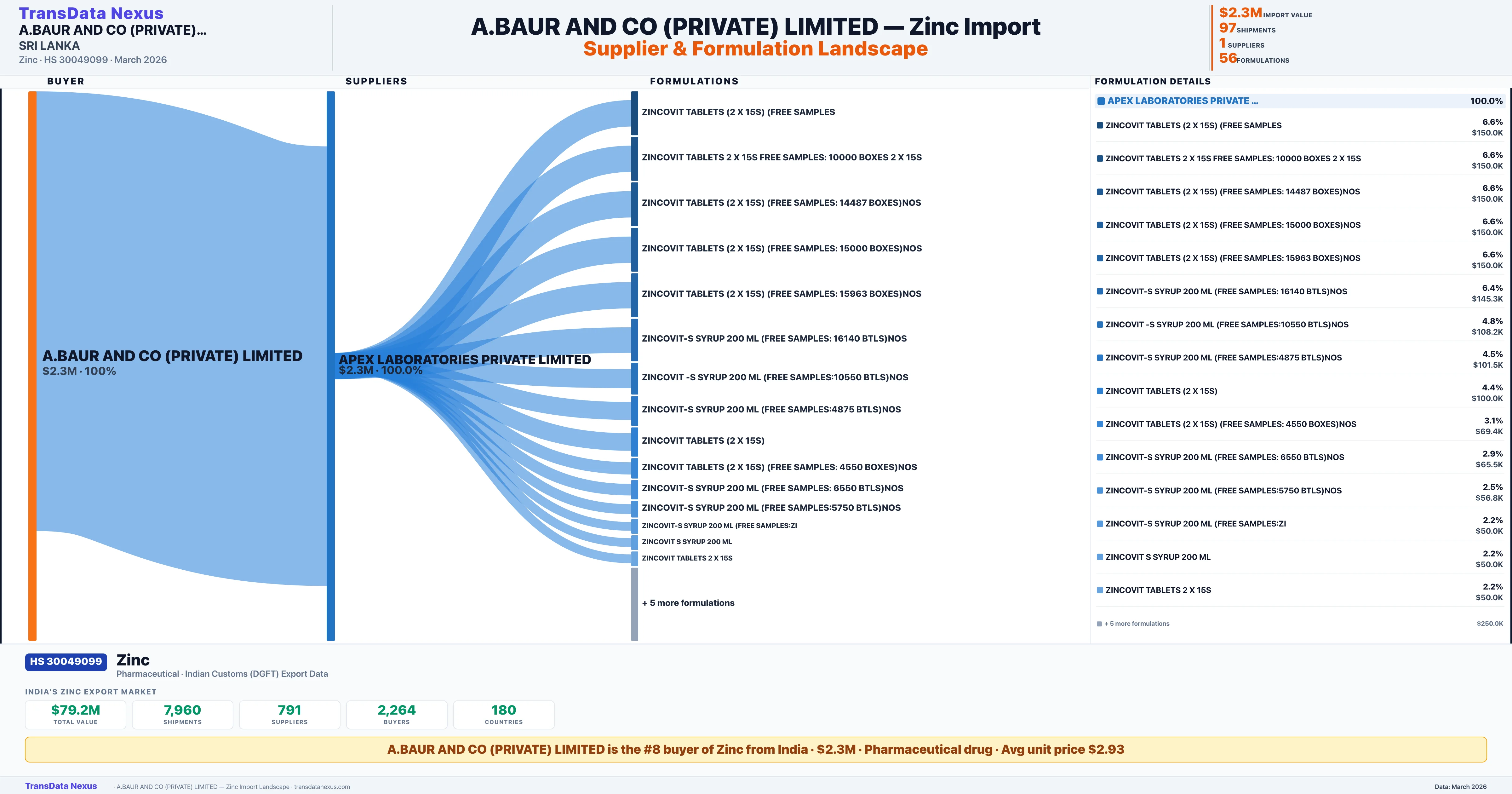 A.BAUR AND CO (PRIVATE) LIMITED sources Zinc from 1 verified Indian supplier: APEX LABORATORIES PRIVATE LIMITED ($2.3M, 100.0%). This is based on 97 customs records.