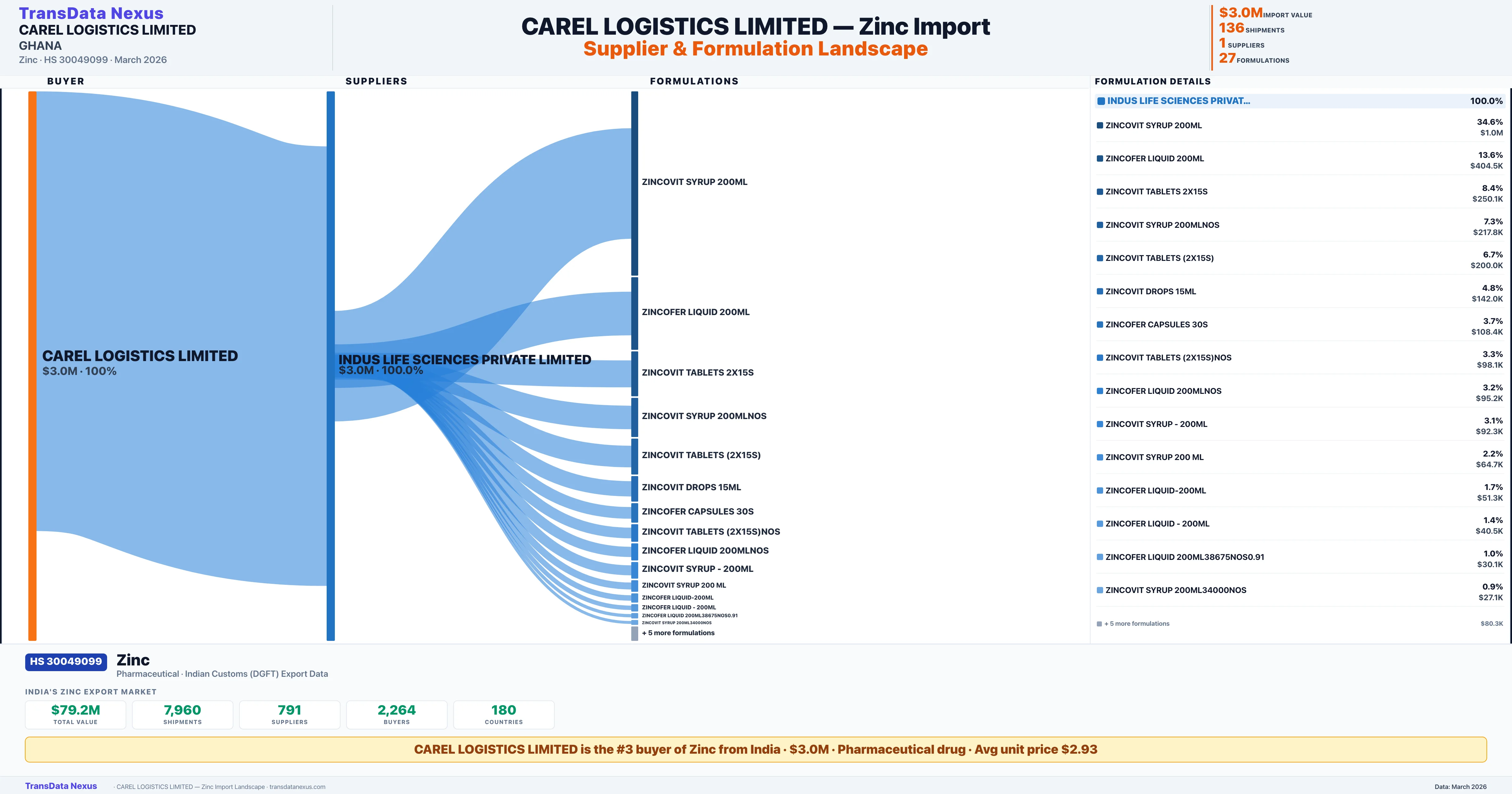 CAREL LOGISTICS LIMITED sources Zinc from 1 verified Indian supplier: INDUS LIFE SCIENCES PRIVATE LIMITED ($3.0M, 100.0%). This is based on 136 customs records.