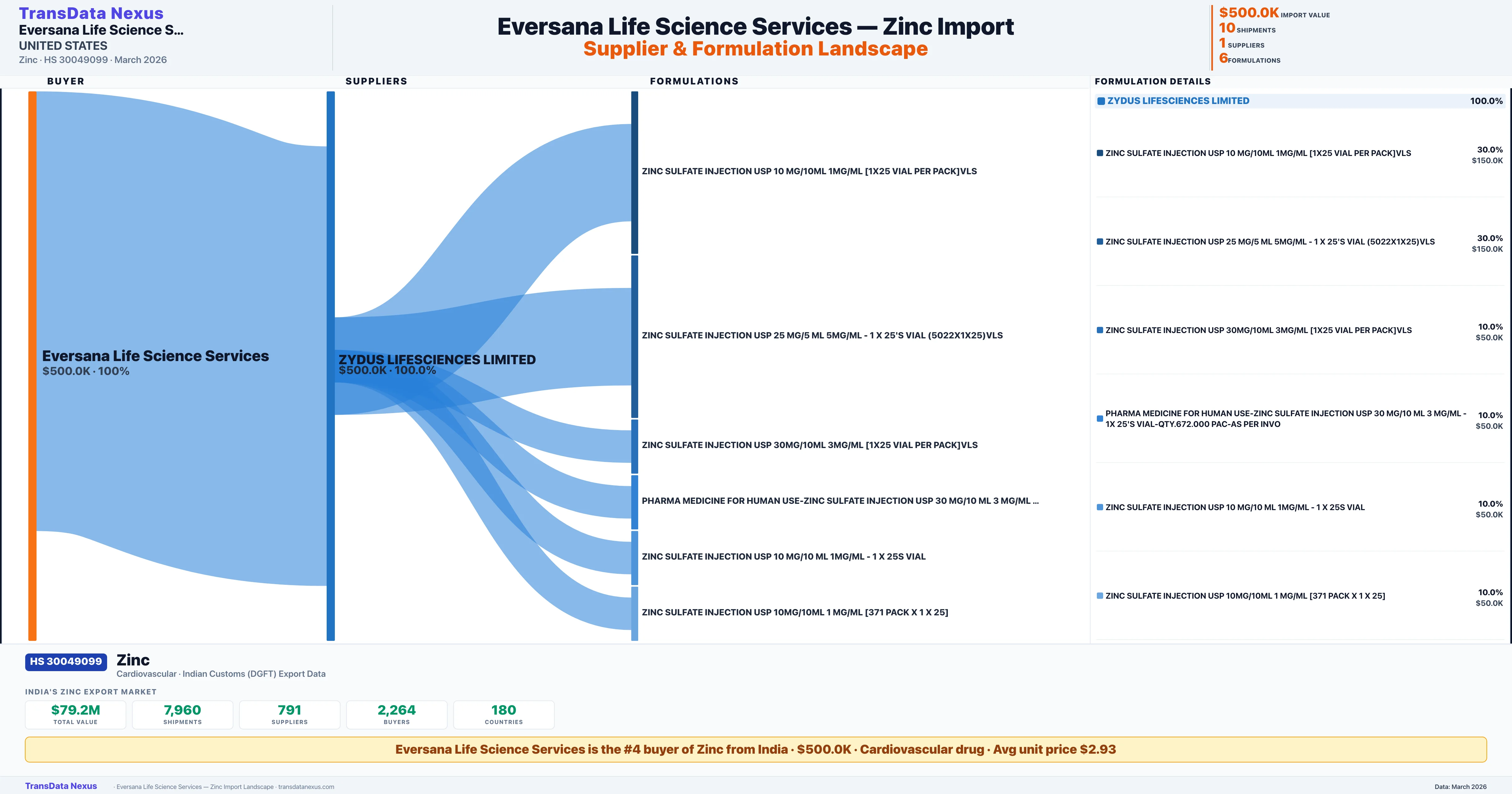 EVERSANA LIFE SCIENCE SERVICES sources Zinc from 1 verified Indian supplier: ZYDUS LIFESCIENCES LIMITED ($500.0K, 100.0%). This is based on 10 customs records.