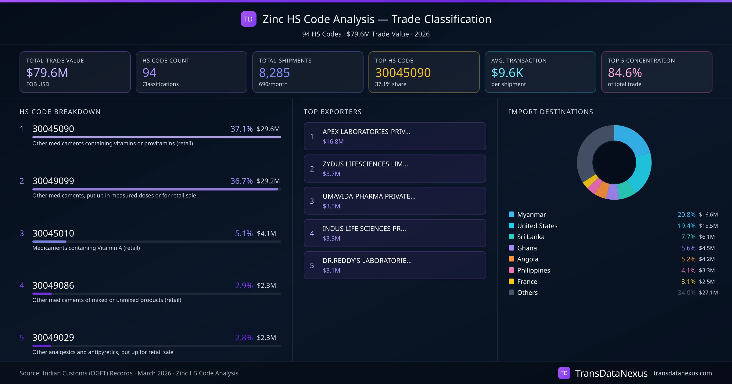 The classification of "Zinc" under HS code 30045090 pertains to medicaments containing vitamins or other products of heading 29.36, put up in measured doses or forms for retail sale. Tariff rates for this classification vary across countries and are influenced by Most Favored Nation (MFN) rates, Free Trade Agreements (FTAs) with India, and exemptions for essential medicines.