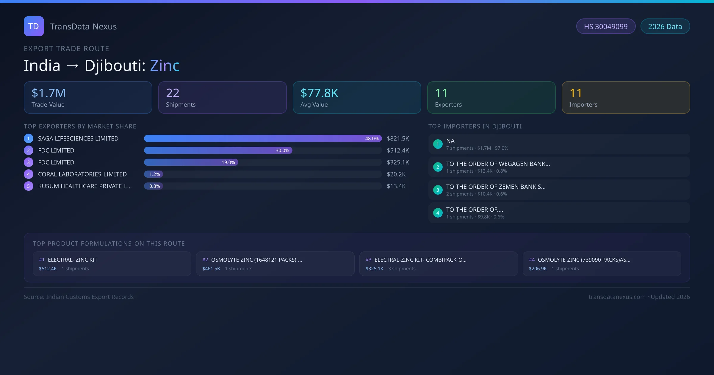 India has recorded 22 verified shipments of Zinc exported to Djibouti, representing a combined trade value of $1.7M USD. This corridor is served by 11 active Indian exporters, with an average shipment value of $77.8K USD. The leading Indian exporter is SAGA LIFESCIENCES LIMITED , which accounts for 48% of total export value with 3 shipments worth $821.5K USD. On the buying side, NA is the largest importer in Djibouti with $1.7M USD in purchases. The top 3 suppliers — SAGA LIFESCIENCES LIMITED , FDC LIMITED , FDC LIMITED — together control 97% of total trade value on this route. All data sourced from Indian Customs (DGFT) shipping bill records. Values reported in FOB USD.