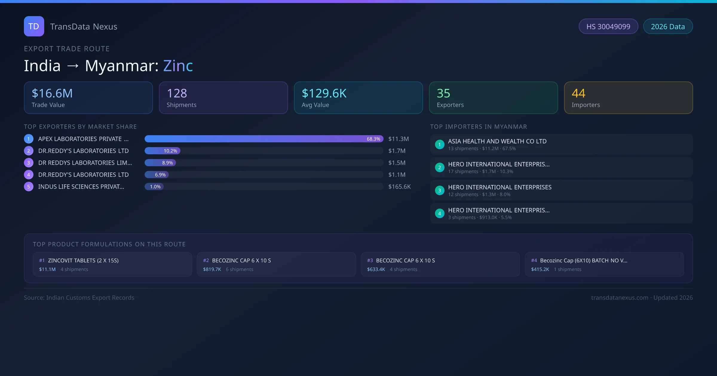 The India to Myanmar Zinc corridor is one of India's established pharmaceutical export routes, with 128 shipments documented worth a combined $16.6M USD. The route is dominated by APEX LABORATORIES PRIVATE LIMITED, which alone accounts for roughly 68% of all export value, reflecting the consolidated nature of India's zinc manufacturing sector.