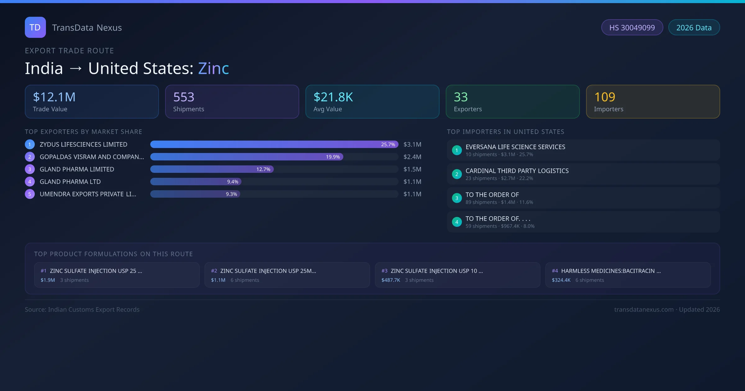 India has recorded 553 verified shipments of Zinc exported to United States, representing a combined trade value of $12.1M USD. This corridor is served by 33 active Indian exporters, with an average shipment value of $21.8K USD. The leading Indian exporter is ZYDUS LIFESCIENCES LIMITED, which accounts for 26% of total export value with 10 shipments worth $3.1M USD. On the buying side, EVERSANA LIFE SCIENCE SERVICES is the largest importer in United States with $3.1M USD in purchases. The top 3 suppliers — ZYDUS LIFESCIENCES LIMITED, GOPALDAS VISRAM AND COMPANY LIMITED, GLAND PHARMA LIMITED — together control 58% of total trade value on this route. All data sourced from Indian Customs (DGFT) shipping bill records. Values reported in FOB USD.