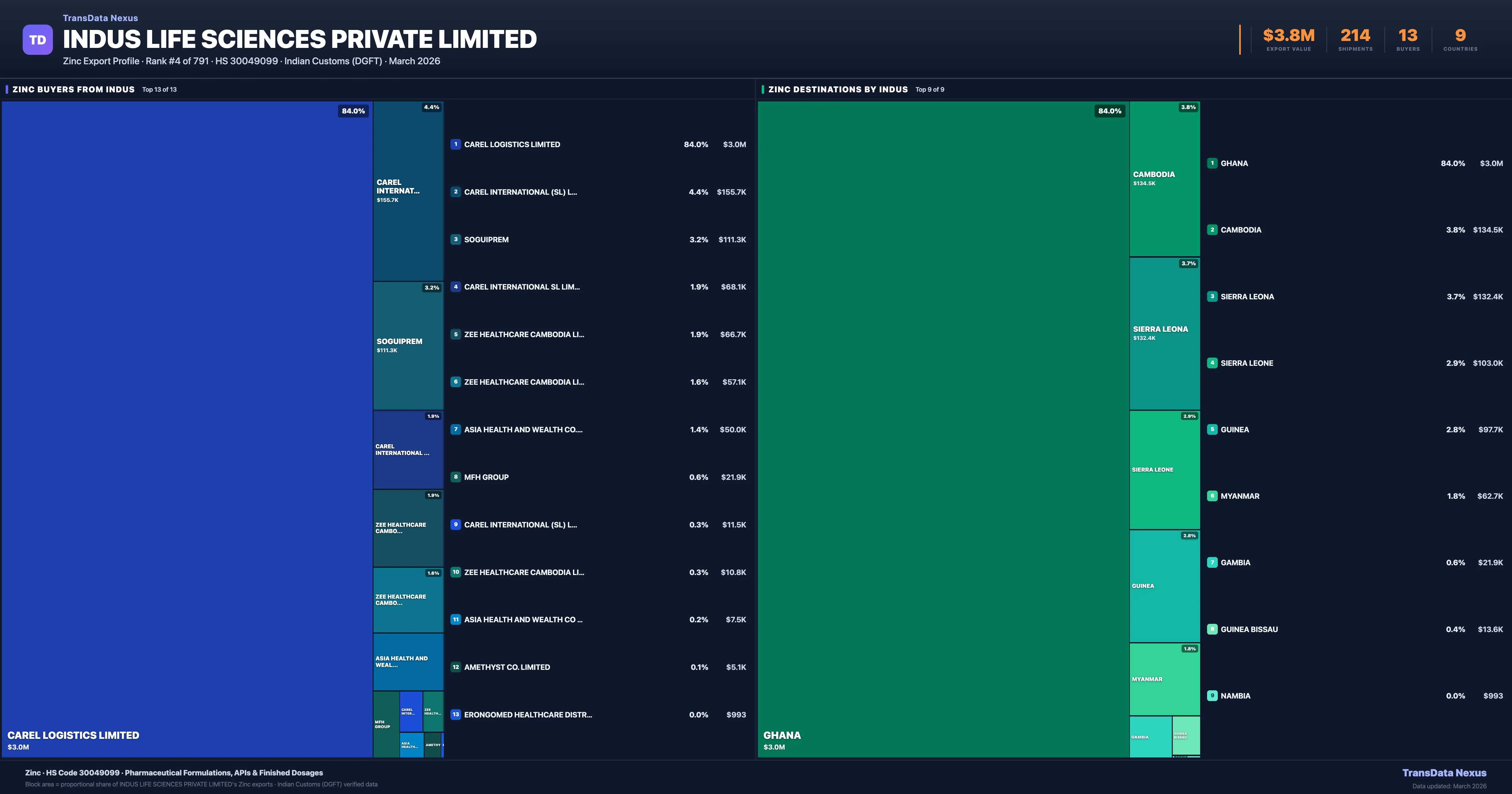 Indus Life Sciences Private Limited supplies Zinc to 13 buyers globally. The largest buyer is CAREL LOGISTICS LIMITED (GHANA), followed by CAREL INTERNATIONAL (SL) LIMITED. (SIERRA LEONA) and SOGUIPREM (GUINEA). These buyers represent pharmaceutical distributors, hospital groups, and government procurement agencies in their respective markets.