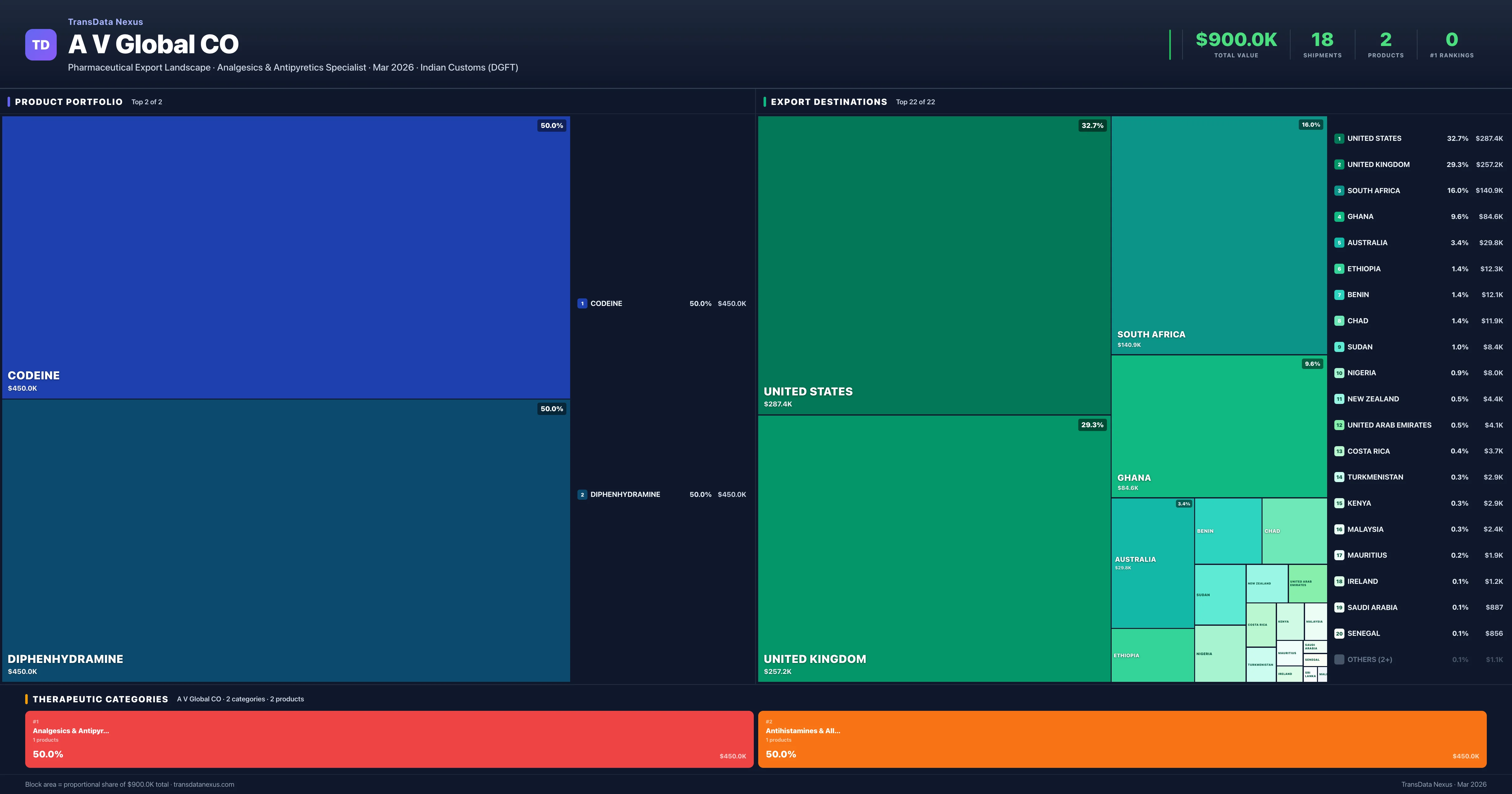 A V Global CO exports 2 pharmaceutical products across 2 therapeutic categories. The top exports are Codeine ($450.0K), Diphenhydramine ($450.0K). Total export value is $900.0K.