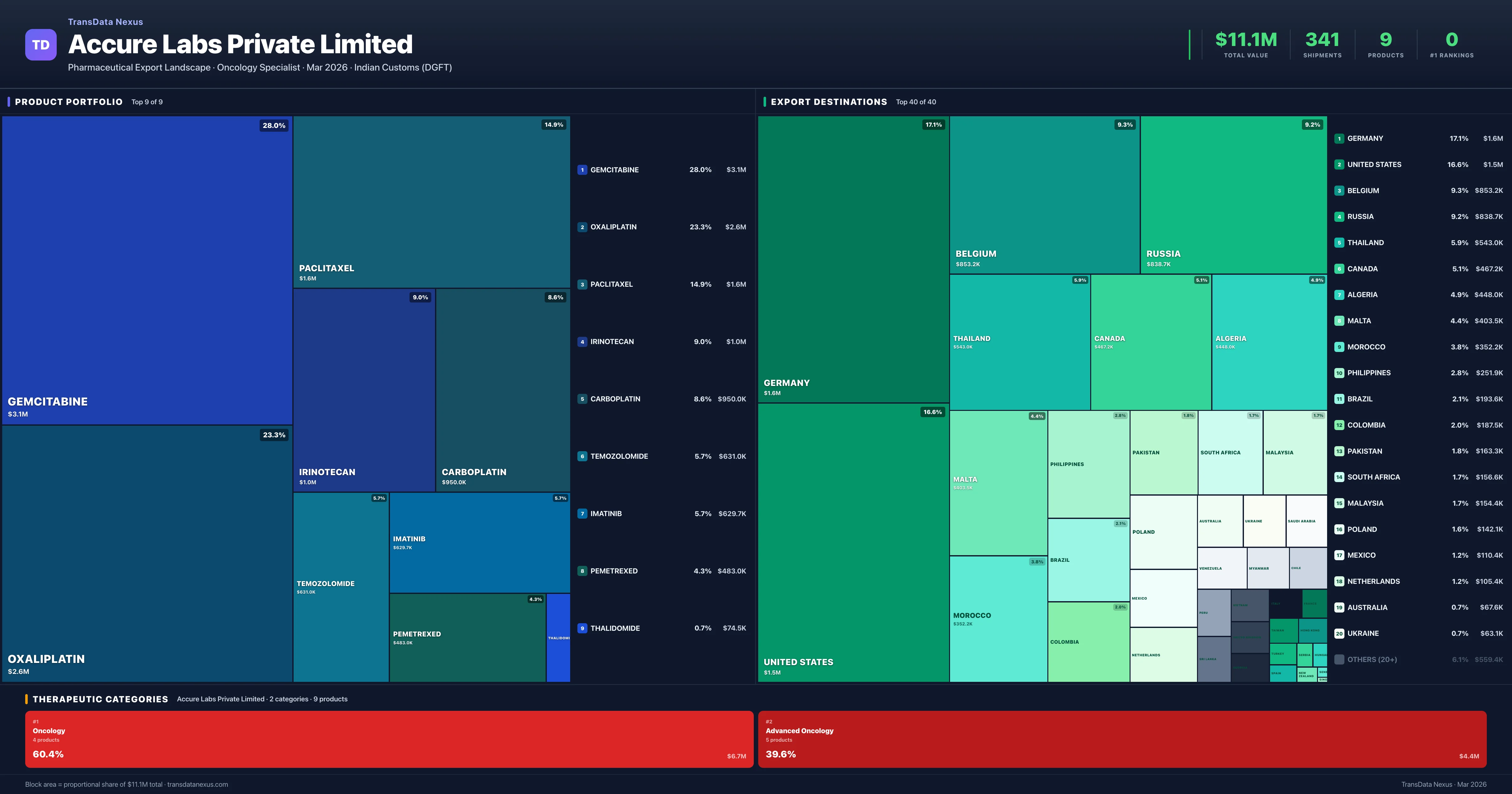 Accure Labs Private Limited exports 9 pharmaceutical products across 2 therapeutic categories. The top exports are Gemcitabine ($3.1M), Oxaliplatin ($2.6M), Paclitaxel ($1.6M), Irinotecan ($1.0M), Carboplatin ($950.0K). Total export value is $11.1M.