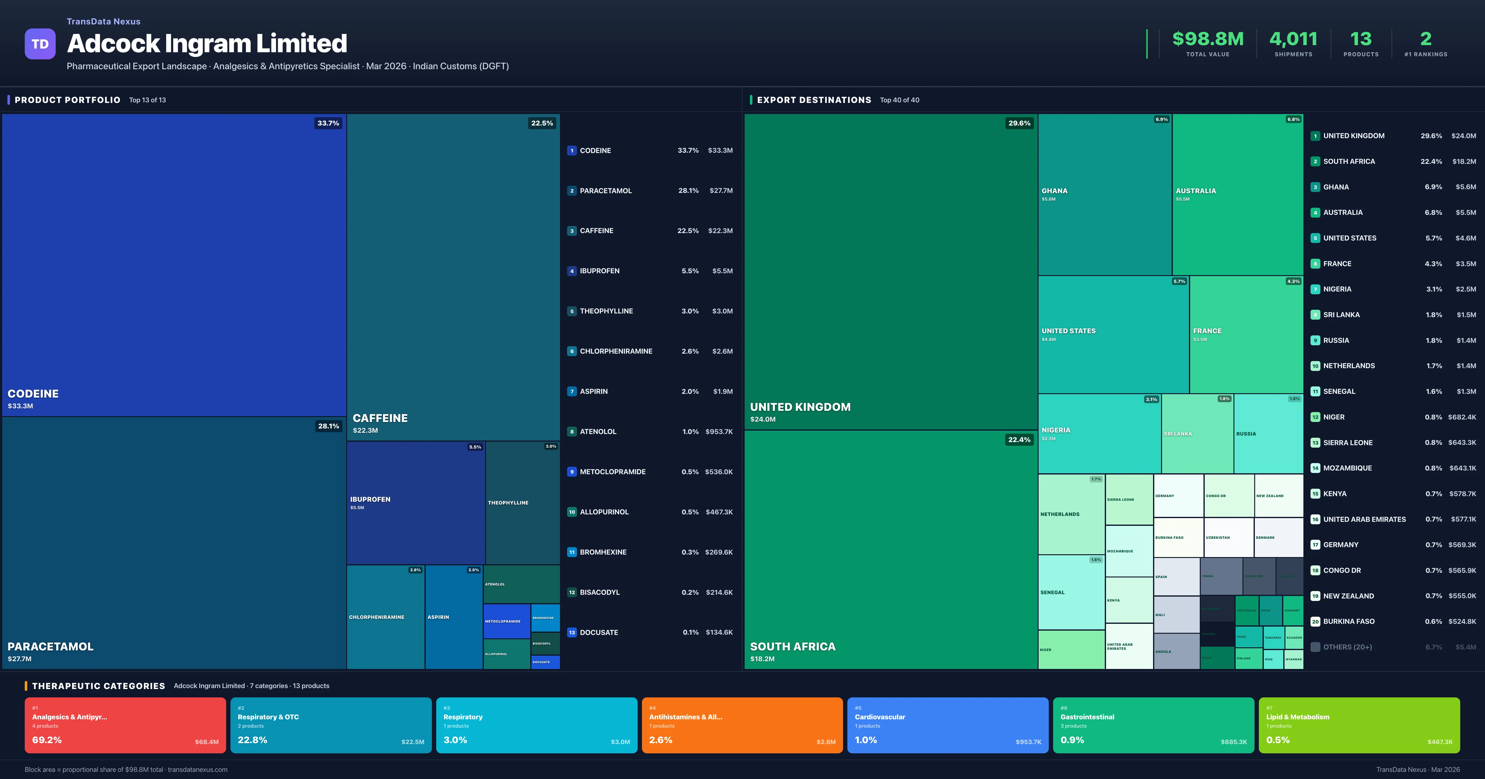 Adcock Ingram Limited is an Indian pharmaceutical exporter with a total trade value of $98.8M across 13 products in 7 therapeutic categories. Based on 4,011 verified export shipments from Indian Customs (DGFT) records, Adcock Ingram Limited is the #1 Indian exporter in 2 products including Paracetamol, Caffeine. Top exports include Codeine ($33.3M), Paracetamol ($27.7M), Caffeine ($22.3M).