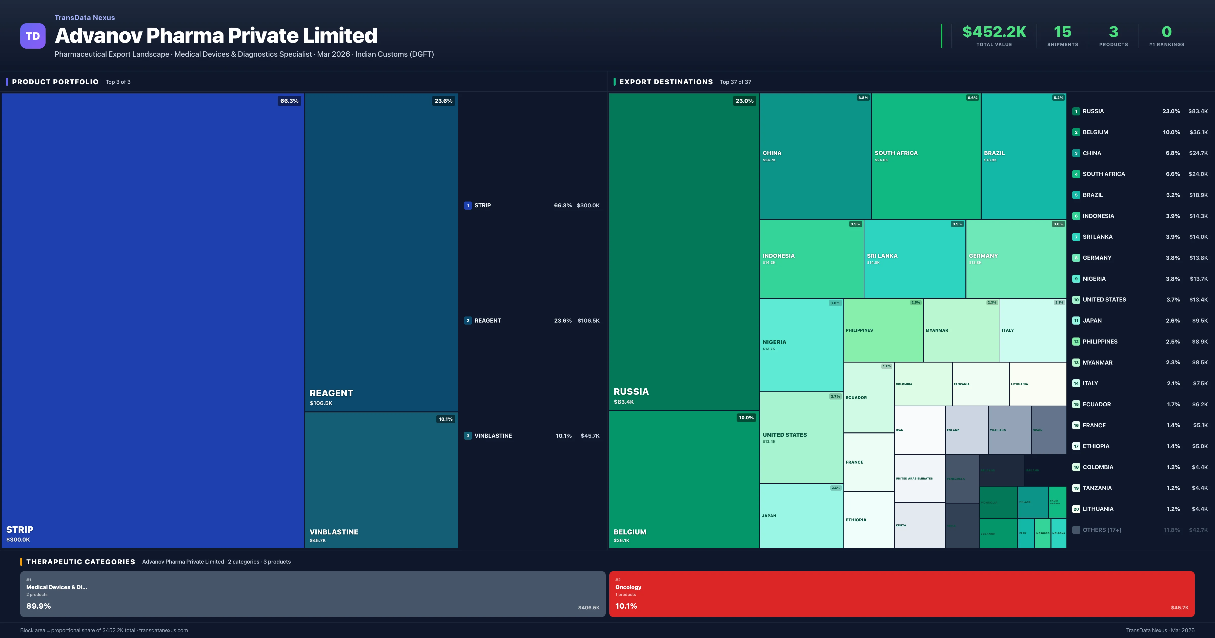 Advanov Pharma Private Limited is an Indian pharmaceutical exporter with a total trade value of $452.2K across 3 products in 2 therapeutic categories. Based on 15 verified export shipments from Indian Customs (DGFT) records, the company actively competes across multiple product segments. Top exports include Strip ($300.0K), Reagent ($106.5K), Vinblastine ($45.7K).