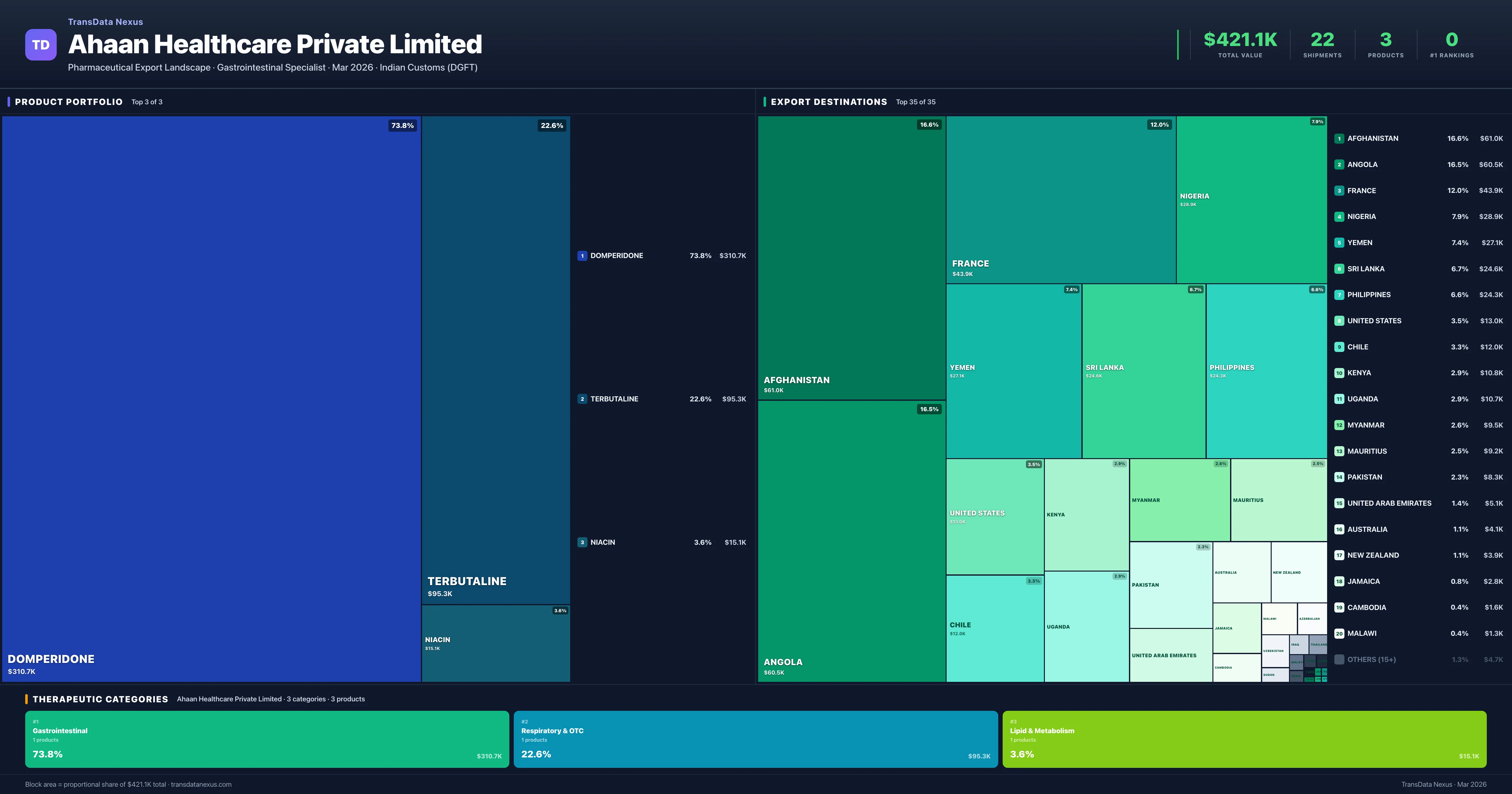 Ahaan Healthcare Private Limited exports 3 pharmaceutical products across 3 therapeutic categories. The top exports are Domperidone ($310.7K), Terbutaline ($95.3K), Niacin ($15.1K). Total export value is $421.1K.