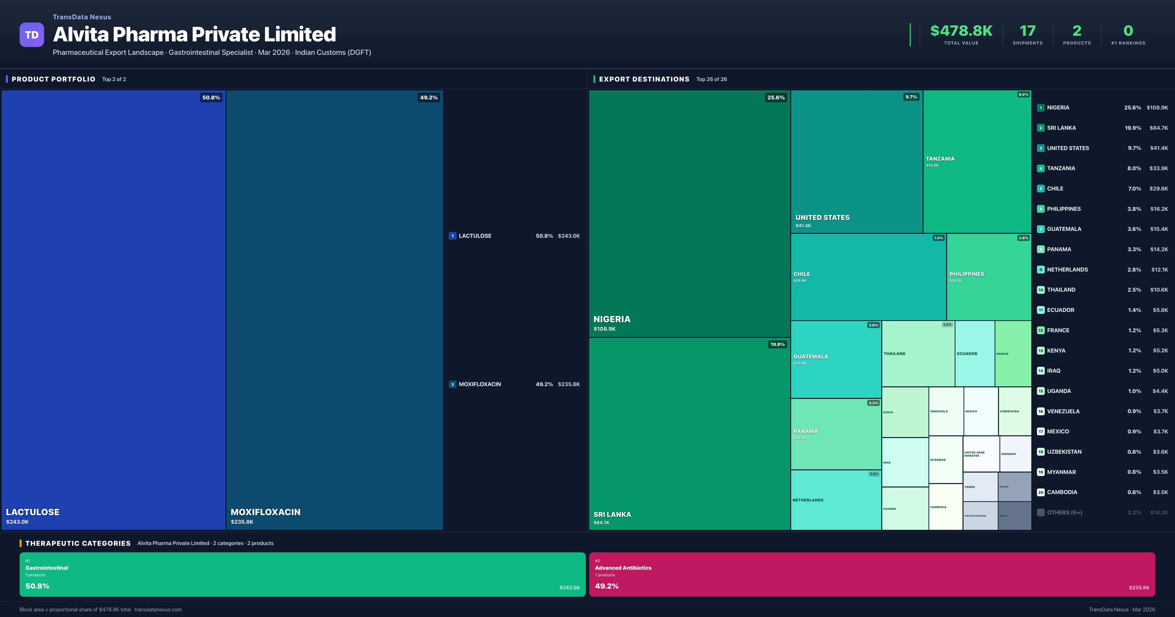 Alvita Pharma Private Limited exports 2 pharmaceutical products across 2 therapeutic categories. The top exports are Lactulose ($243.0K), Moxifloxacin ($235.8K). Total export value is $478.8K.