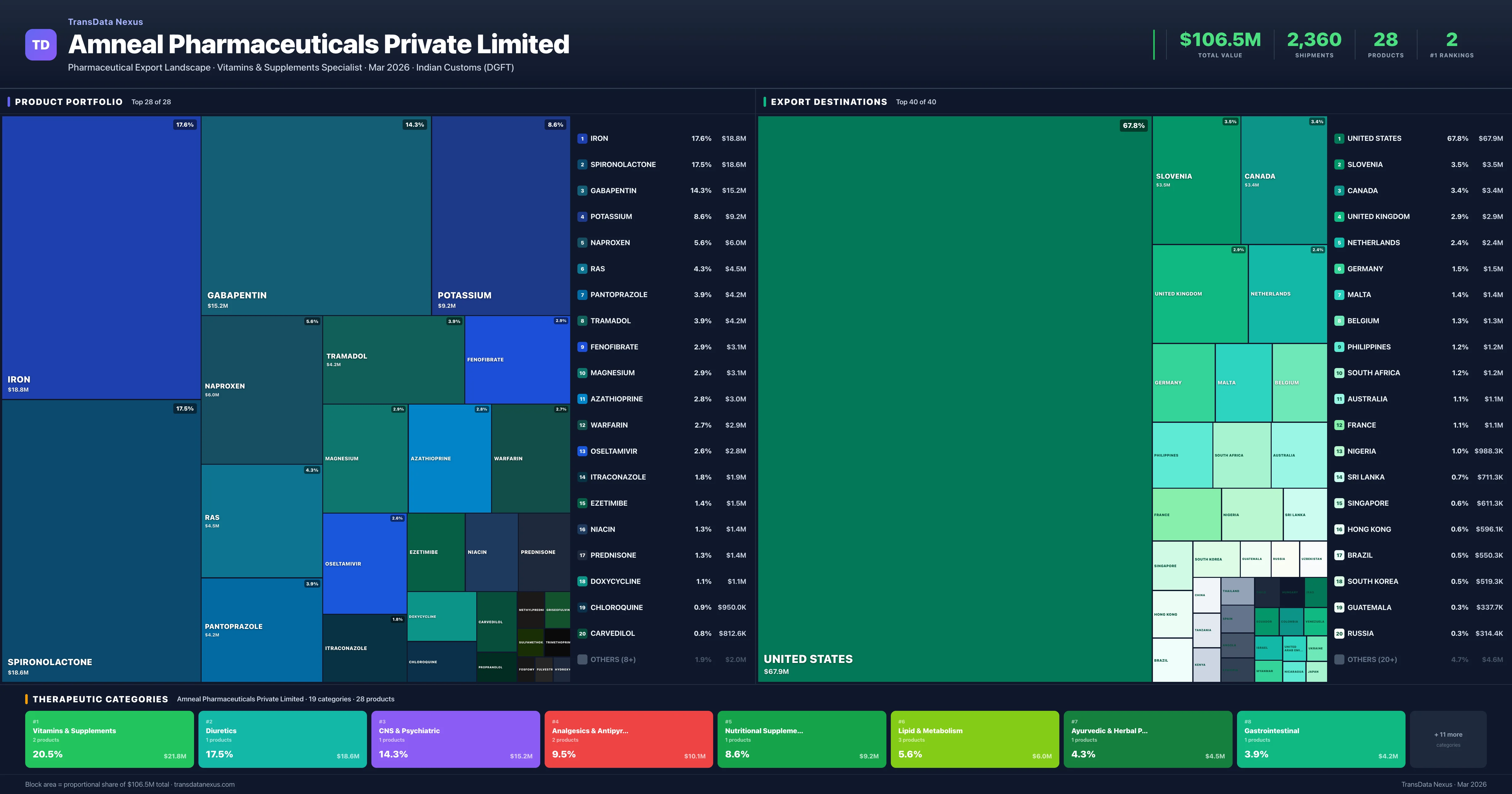 Amneal Pharmaceuticals Private Limited is an Indian pharmaceutical exporter with a total trade value of $106.5M across 28 products in 19 therapeutic categories. Based on 2,360 verified export shipments from Indian Customs (DGFT) records, Amneal Pharmaceuticals Private Limited is the #1 Indian exporter in 2 products including Warfarin, Niacin. Top exports include Iron ($18.8M), Spironolactone ($18.6M), Gabapentin ($15.2M).