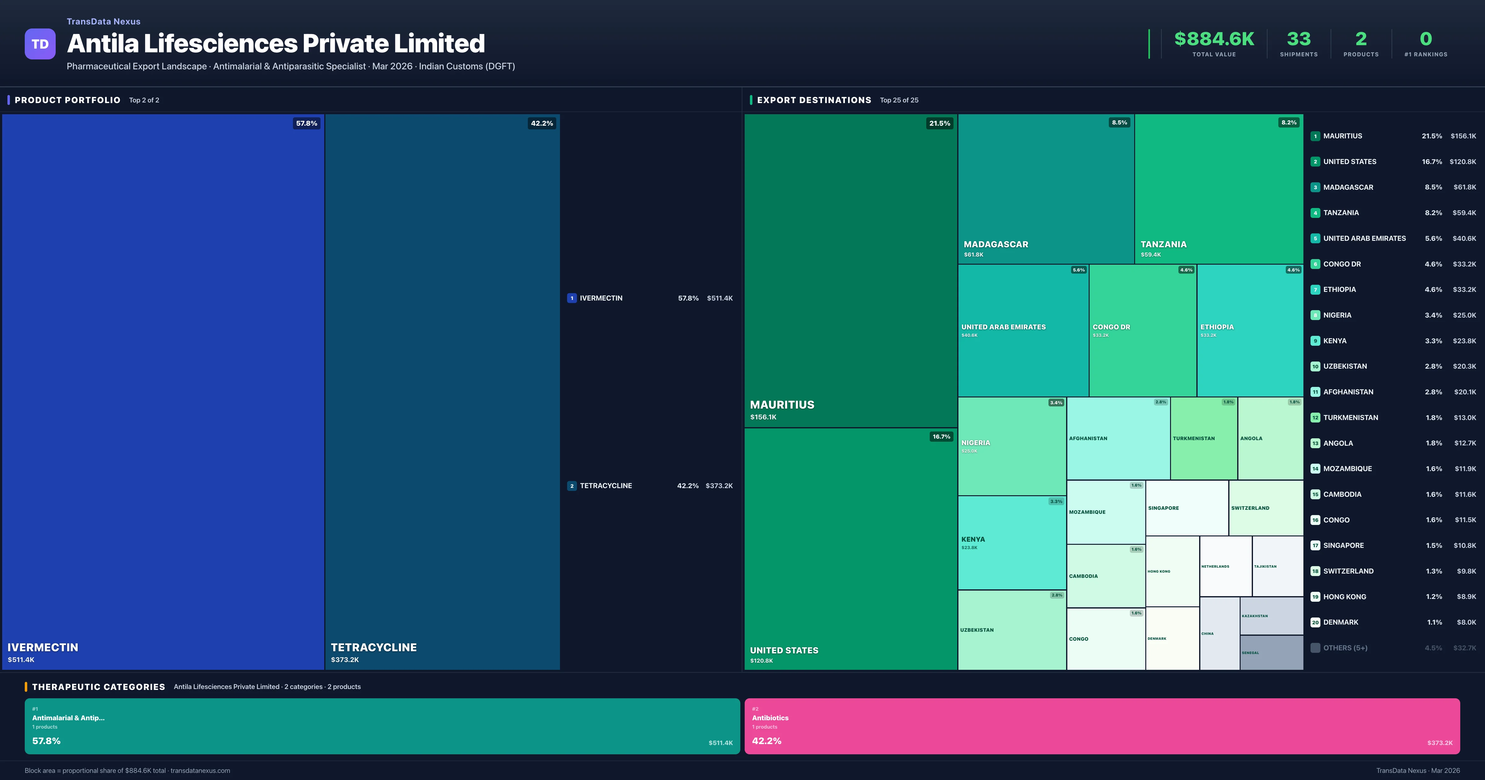 Antila Lifesciences Private Limited is an Indian pharmaceutical exporter with a total trade value of $884.6K across 2 products in 2 therapeutic categories. Based on 33 verified export shipments from Indian Customs (DGFT) records, the company actively competes across multiple product segments. Top exports include Ivermectin ($511.4K), Tetracycline ($373.2K), .