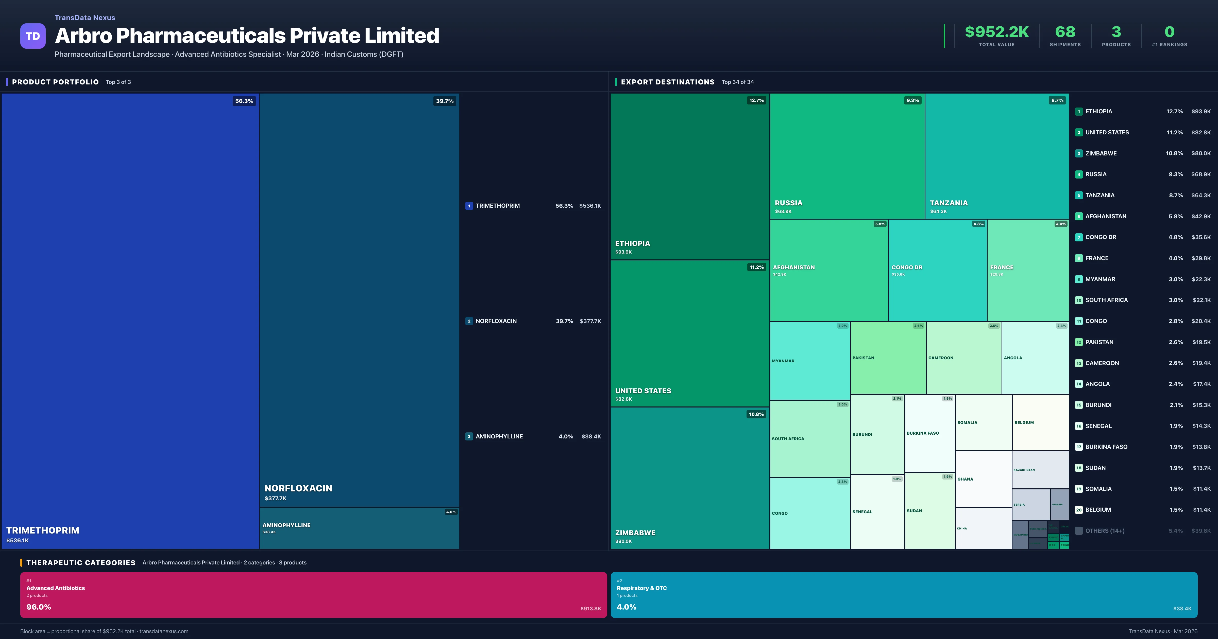 Arbro Pharmaceuticals Private Limited exports 3 pharmaceutical products across 2 therapeutic categories. The top exports are Trimethoprim ($536.1K), Norfloxacin ($377.7K), Aminophylline ($38.4K). Total export value is $952.2K.
