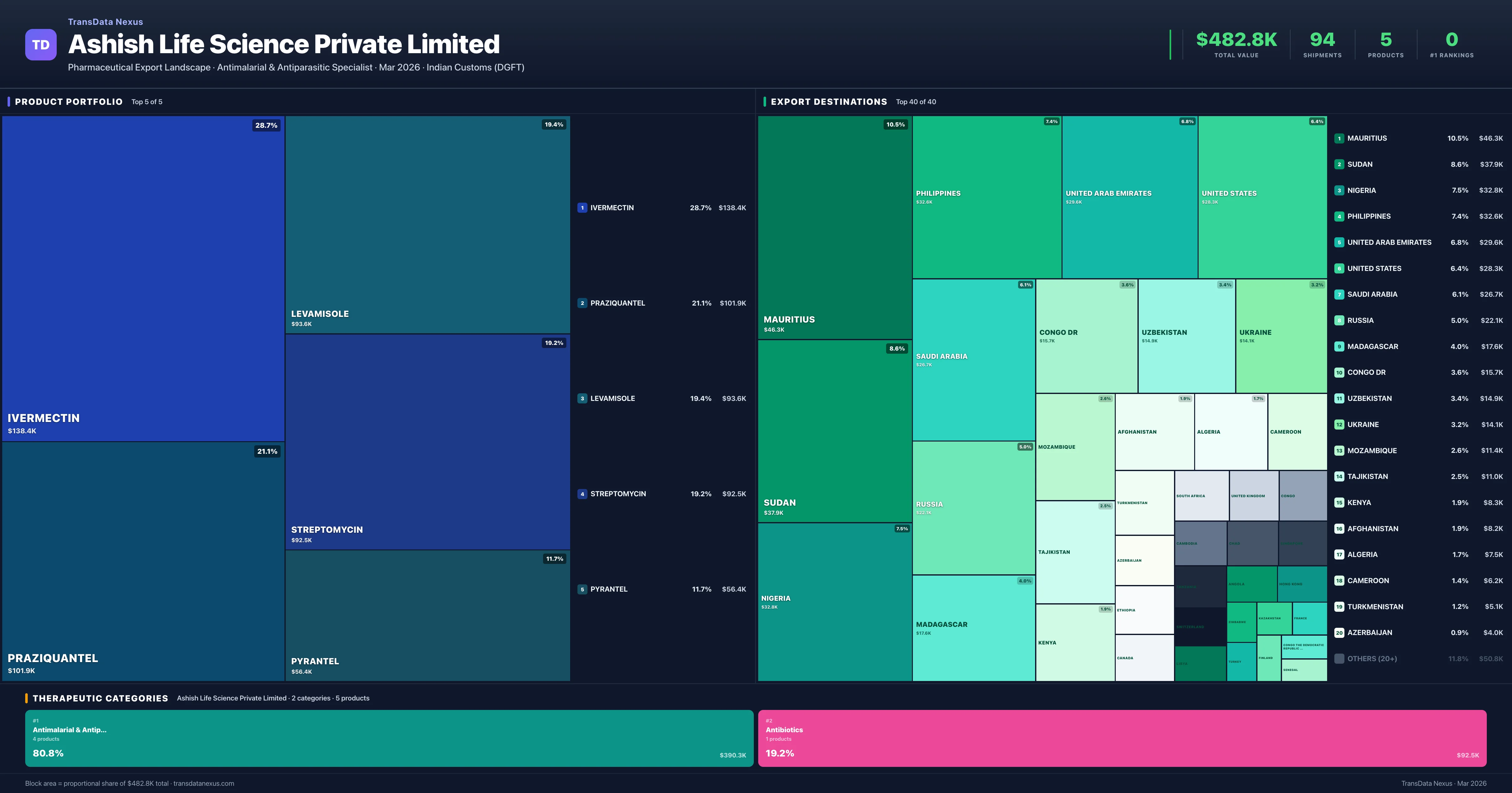 Ashish Life Science Private Limited is an Indian pharmaceutical exporter with a total trade value of $482.8K across 5 products in 2 therapeutic categories. Based on 94 verified export shipments from Indian Customs (DGFT) records, the company actively competes across multiple product segments. Top exports include Ivermectin ($138.4K), Praziquantel ($101.9K), Levamisole ($93.6K).