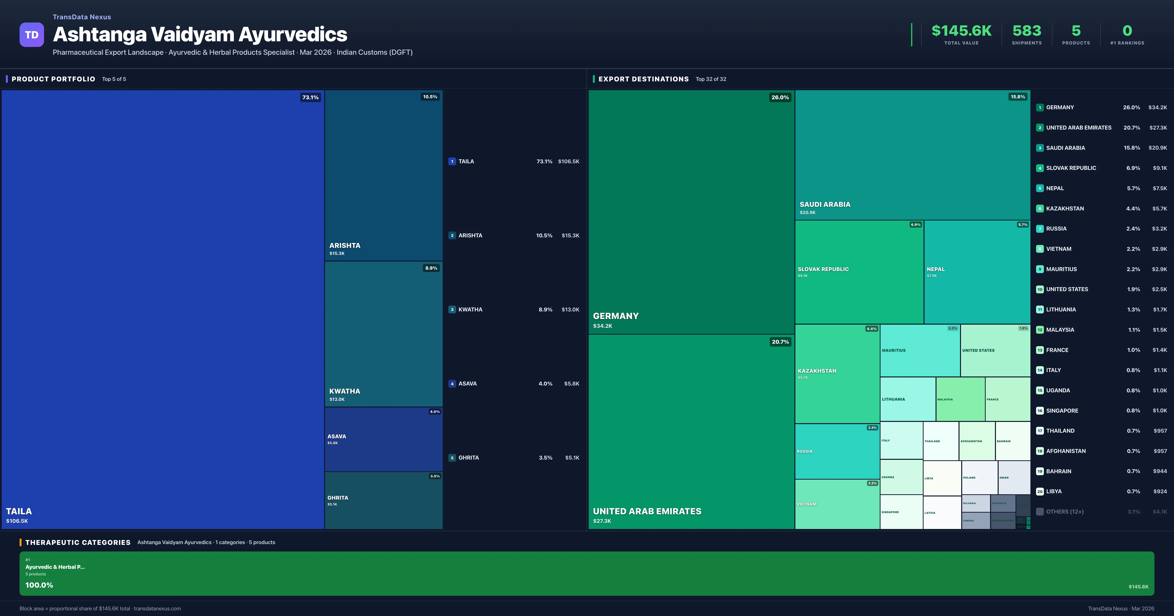 Ashtanga Vaidyam Ayurvedics exports 5 pharmaceutical products across 1 therapeutic categories with a total export value of $145.6K. The top category is Ayurvedic & Herbal Products (100.0% of portfolio), indicating a concentrated portfolio with the top 5 products accounting for 100.0% of total export value.