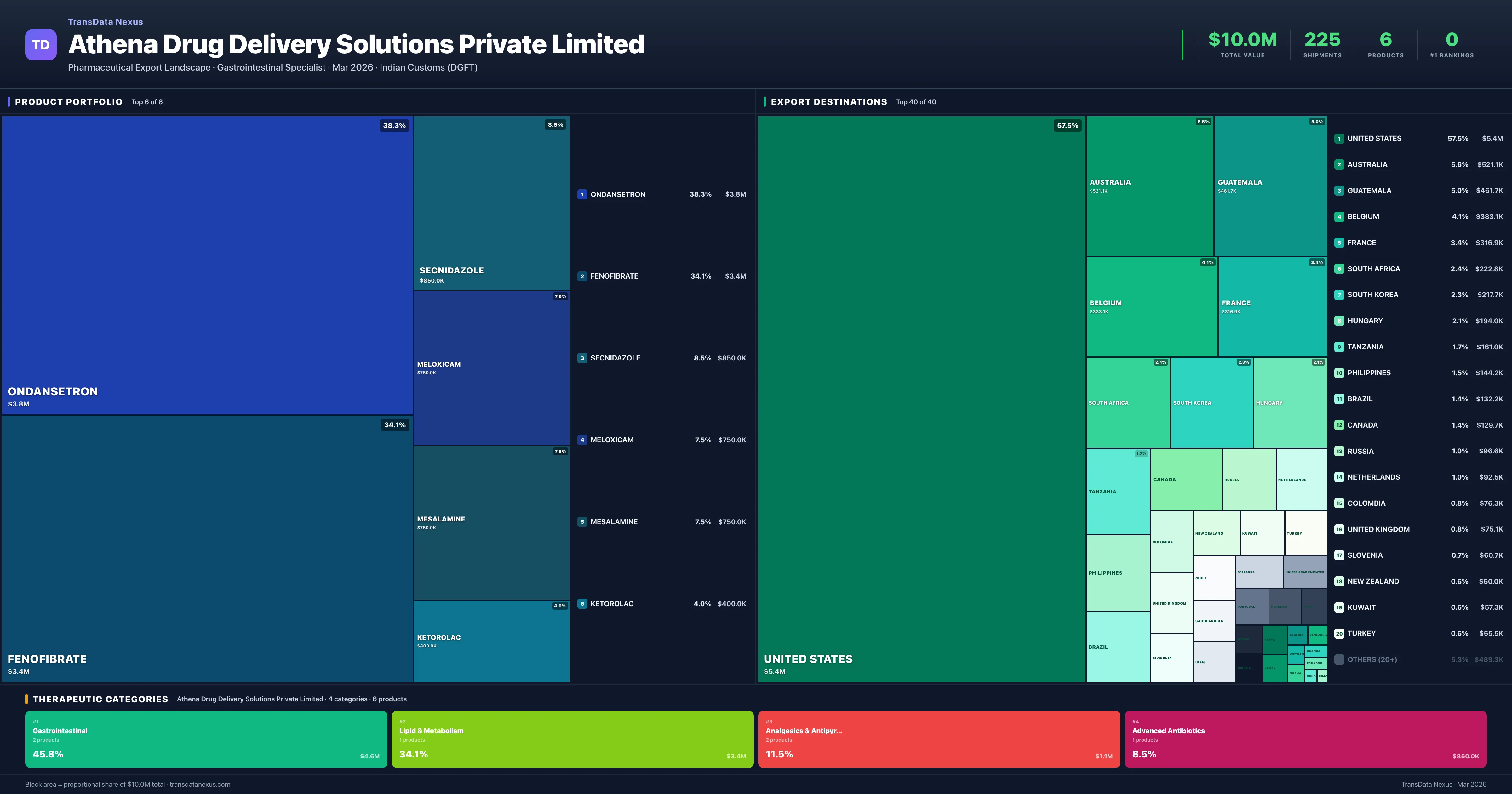 Athena Drug Delivery Solutions Private Limited is an Indian pharmaceutical exporter with a total trade value of $10.0M across 6 products in 4 therapeutic categories. Based on 225 verified export shipments from Indian Customs (DGFT) records, the company actively competes across multiple product segments. Top exports include Ondansetron ($3.8M), Fenofibrate ($3.4M), Secnidazole ($850.0K).