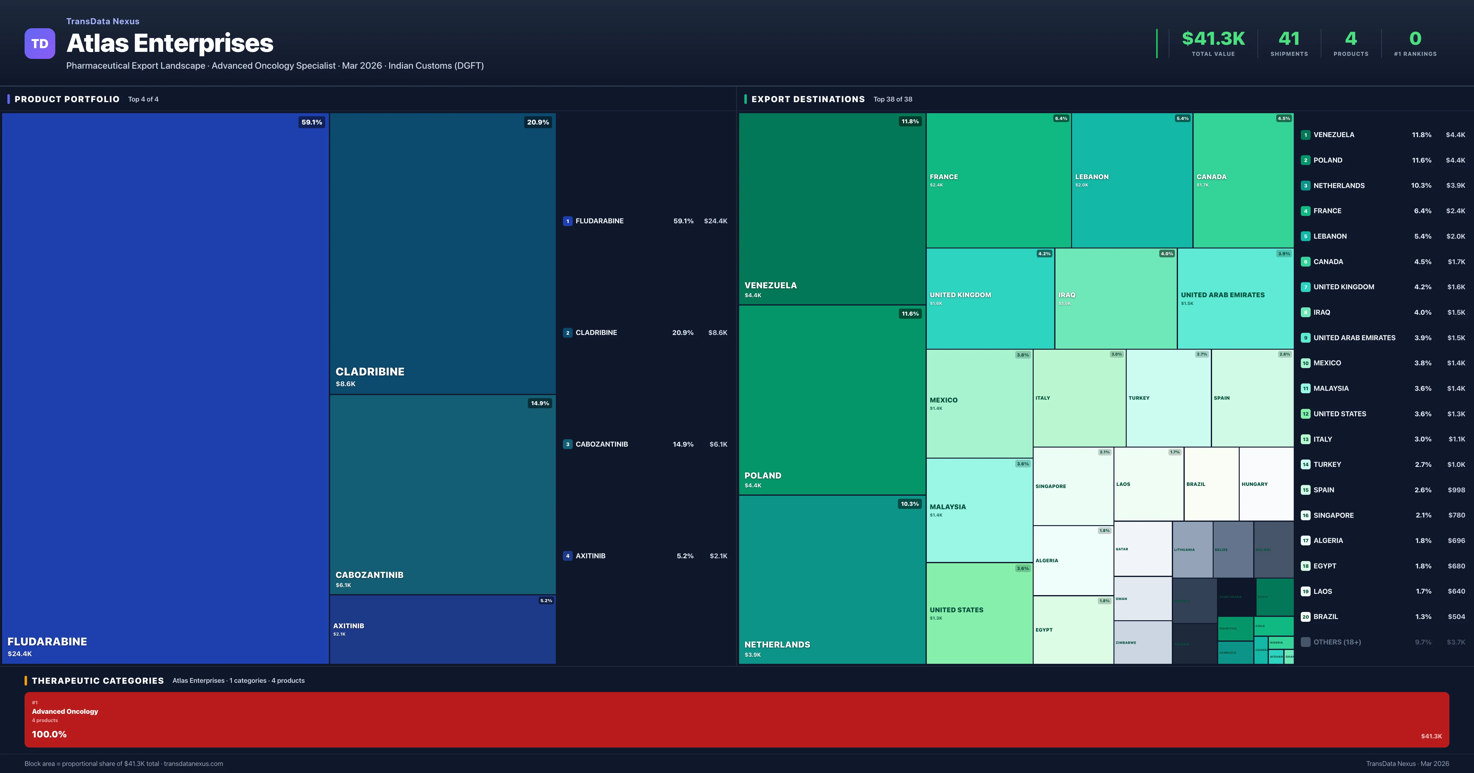 Atlas Enterprises is an Indian pharmaceutical exporter with a total trade value of $41.3K across 4 products in 1 therapeutic categories. Based on 41 verified export shipments from Indian Customs (DGFT) records, the company actively competes across multiple product segments. Top exports include Fludarabine ($24.4K), Cladribine ($8.6K), Cabozantinib ($6.1K).