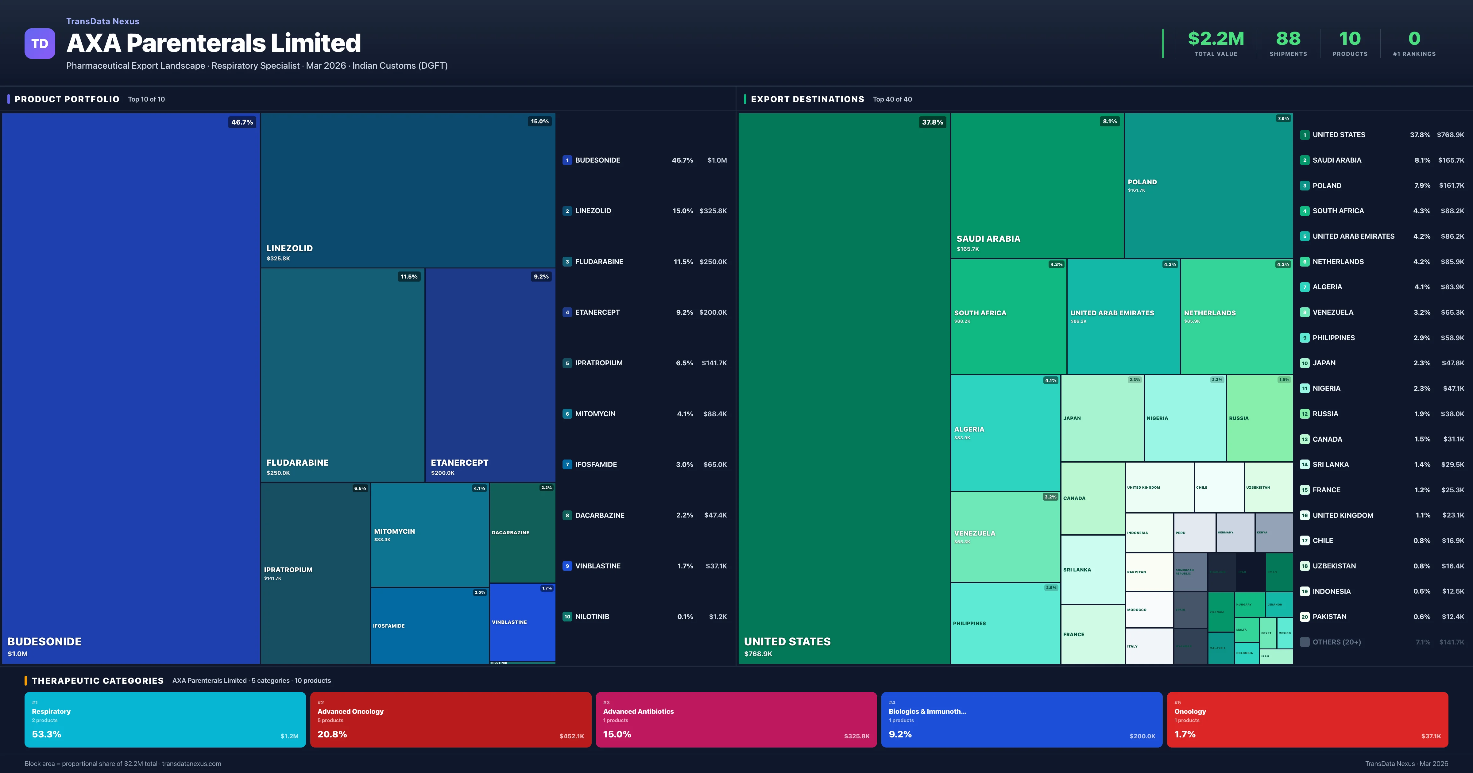 AXA Parenterals Limited operates across 5 therapeutic categories, with Respiratory (53.3%), Advanced Oncology (20.8%), Advanced Antibiotics (15.0%) representing the largest segments by export value. The portfolio is concentrated — the top 5 products account for 89% of total exports.
