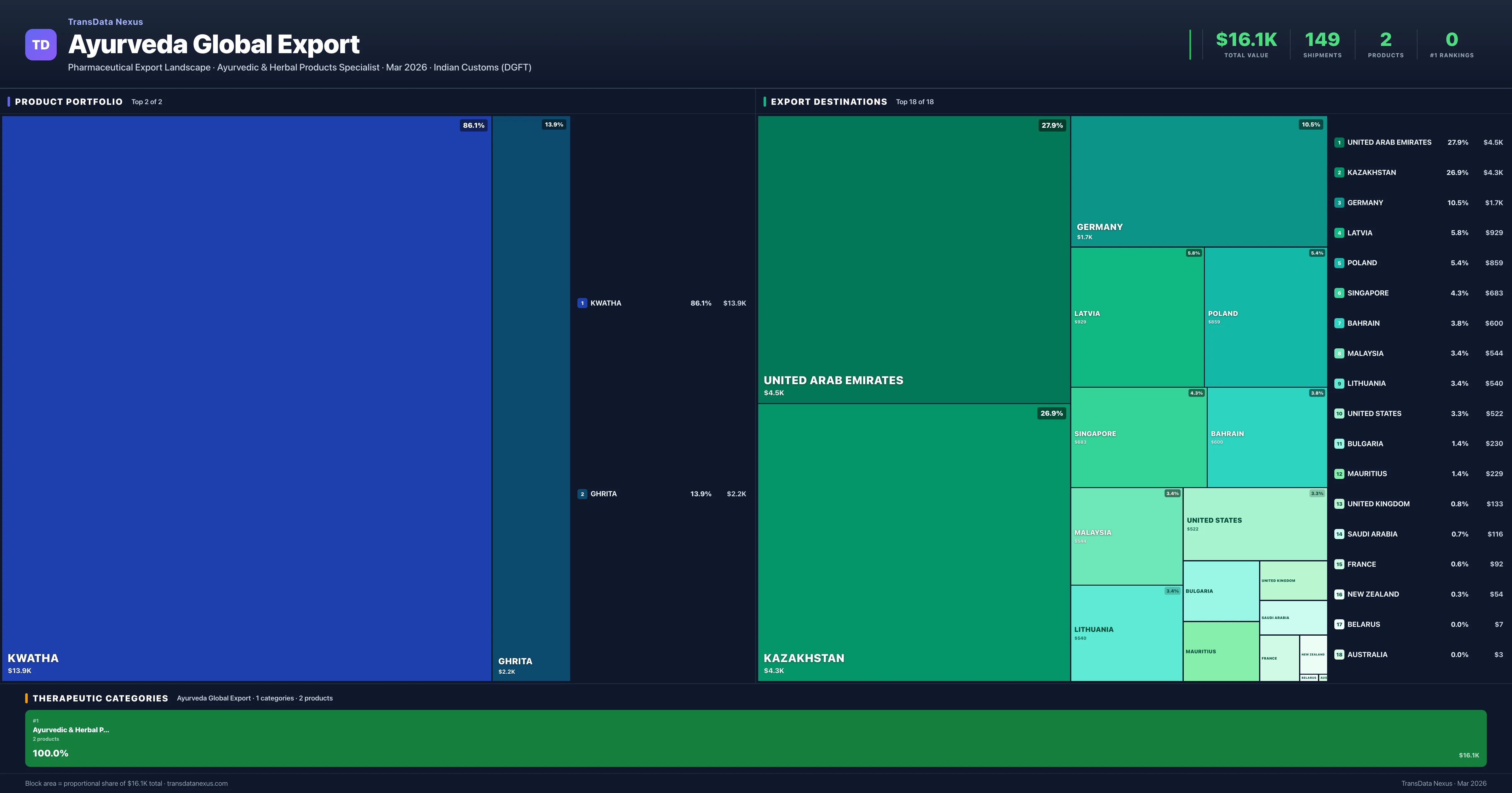 Ayurveda Global Export is an Indian pharmaceutical exporter with a total trade value of $16.1K across 2 products in 1 therapeutic categories. Based on 149 verified export shipments from Indian Customs (DGFT) records, the company actively competes across multiple product segments. Top exports include Kwatha ($13.9K), Ghrita ($2.2K), .