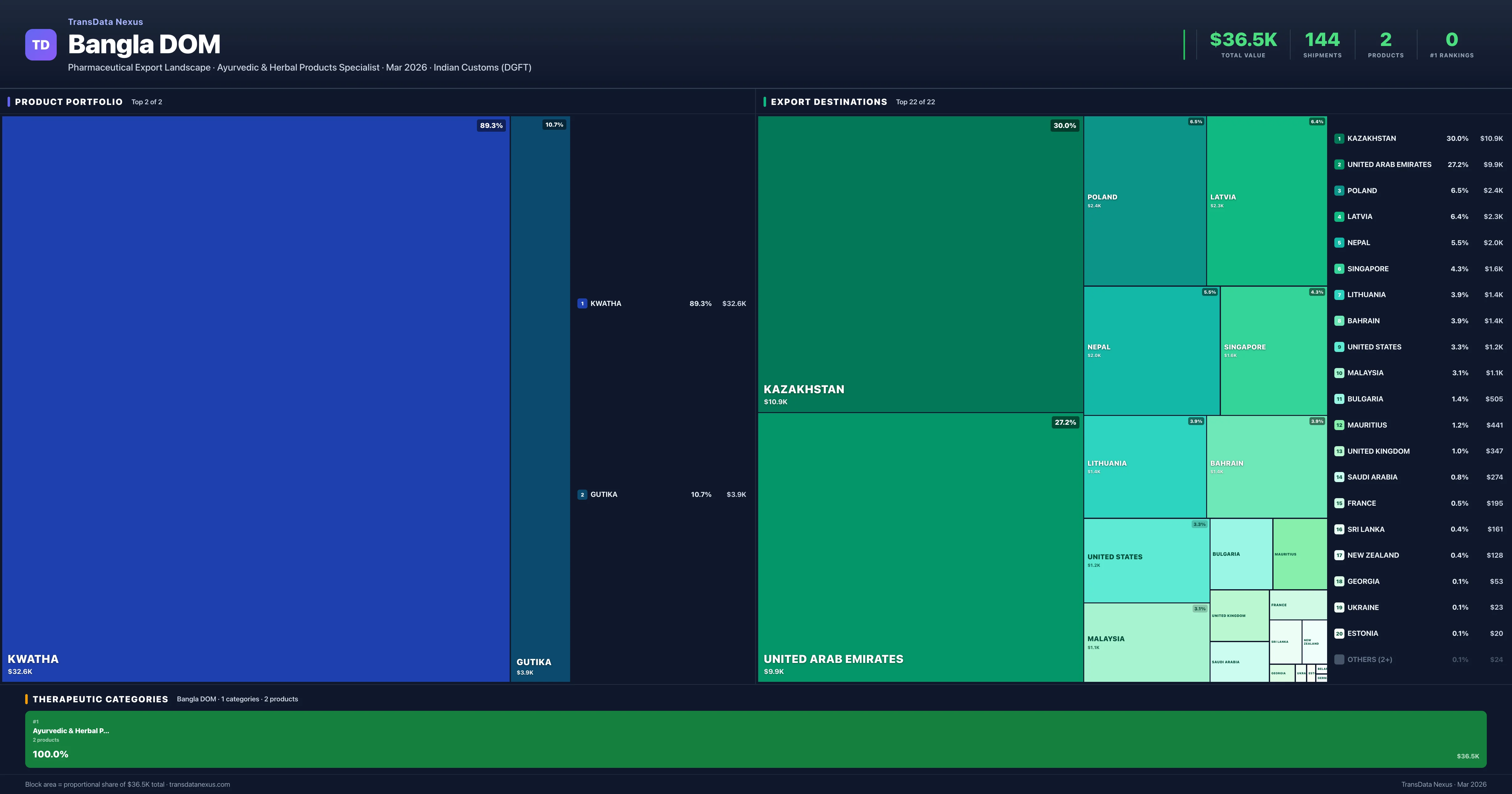 Bangla DOM is an Indian pharmaceutical exporter with a total trade value of $36.5K across 2 products in 1 therapeutic categories. Based on 144 verified export shipments from Indian Customs (DGFT) records, the company actively competes across multiple product segments. Top exports include Kwatha ($32.6K), Gutika ($3.9K), .