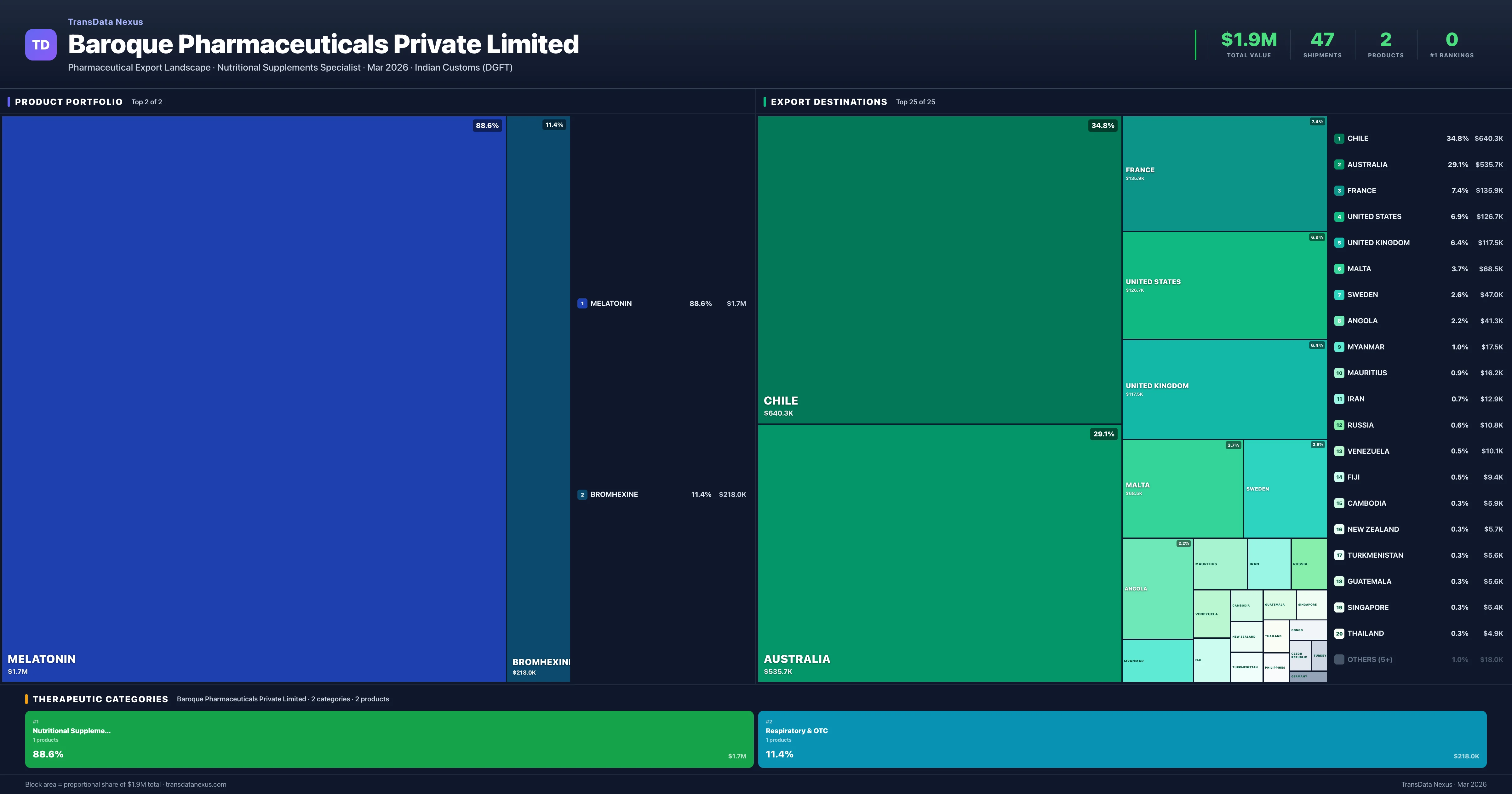 Baroque Pharmaceuticals Private Limited is an Indian pharmaceutical exporter with a total trade value of $1.9M across 2 products in 2 therapeutic categories. Based on 47 verified export shipments from Indian Customs (DGFT) records, the company actively competes across multiple product segments. Top exports include Melatonin ($1.7M), Bromhexine ($218.0K), .