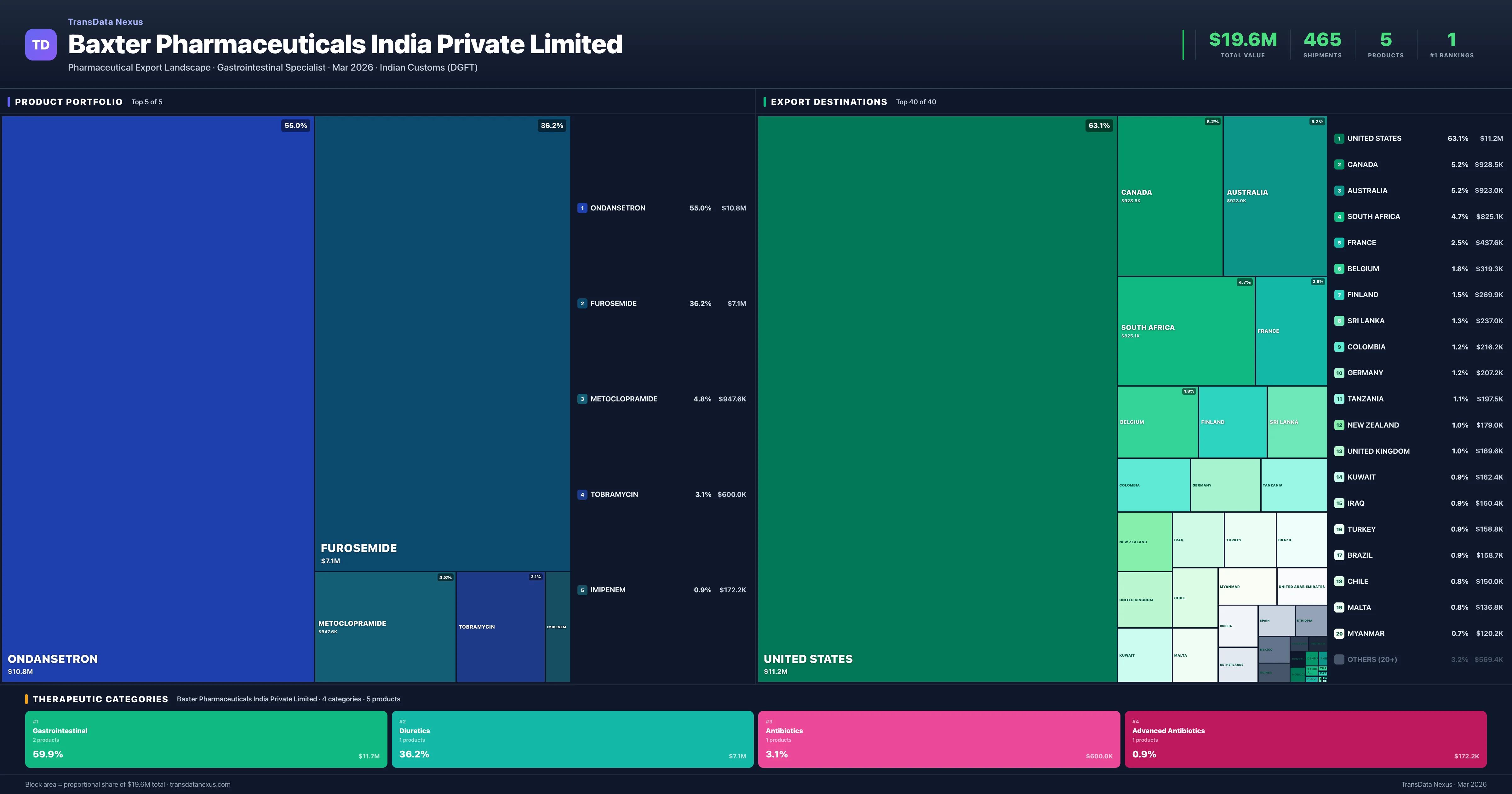 Baxter Pharmaceuticals India Private Limited is an Indian pharmaceutical exporter with a total trade value of $19.6M across 5 products in 4 therapeutic categories. Based on 465 verified export shipments from Indian Customs (DGFT) records, Baxter Pharmaceuticals India Private Limited is the #1 Indian exporter in 1 product including Furosemide. Top exports include Ondansetron ($10.8M), Furosemide ($7.1M), Metoclopramide ($947.6K).