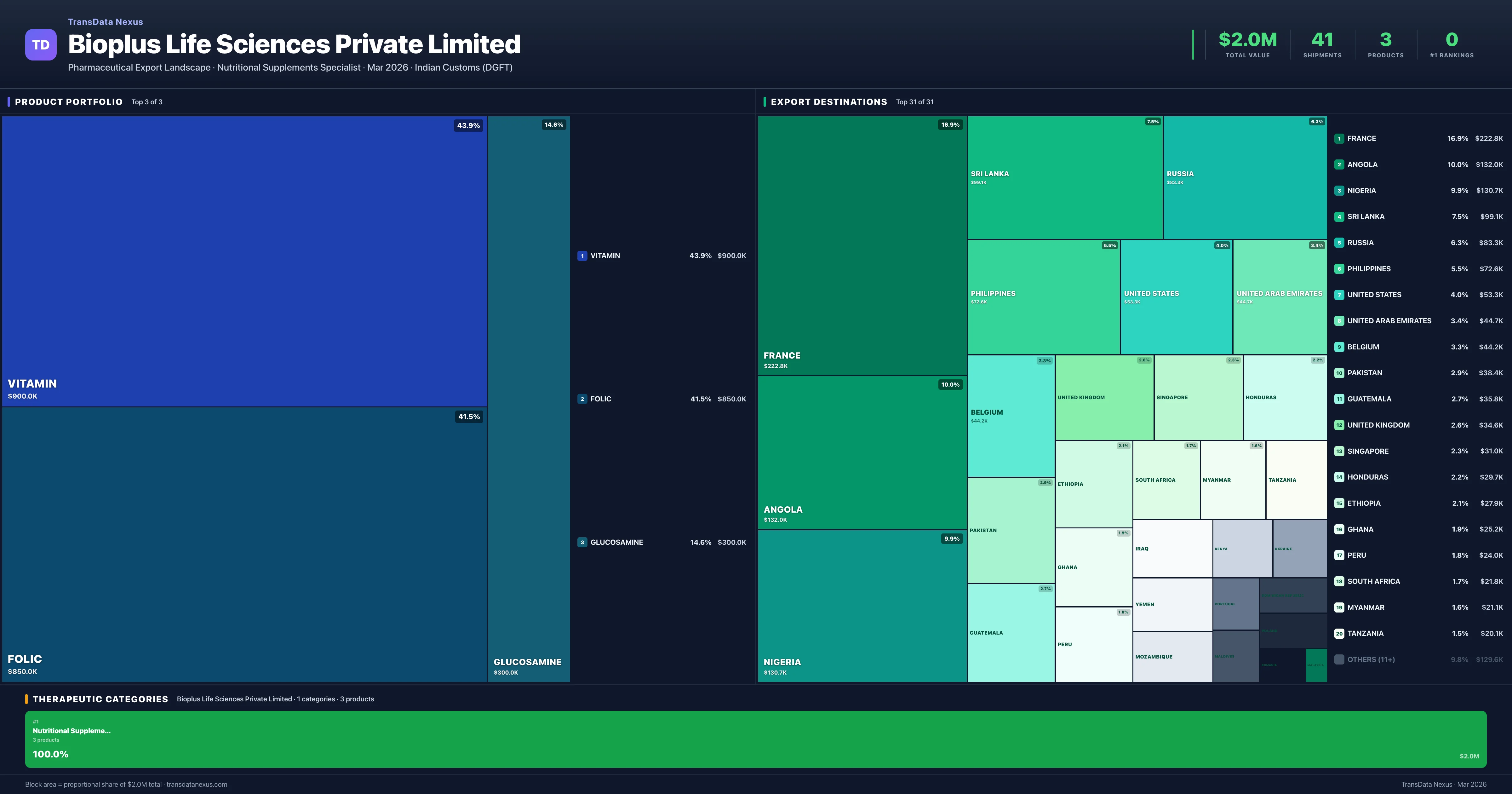 Bioplus Life Sciences Private Limited exports 3 pharmaceutical products across 1 therapeutic categories with a total export value of $2.0M. The top category is Nutritional Supplements (100.0% of portfolio), indicating a concentrated portfolio with the top 5 products accounting for 100.0% of total export value.