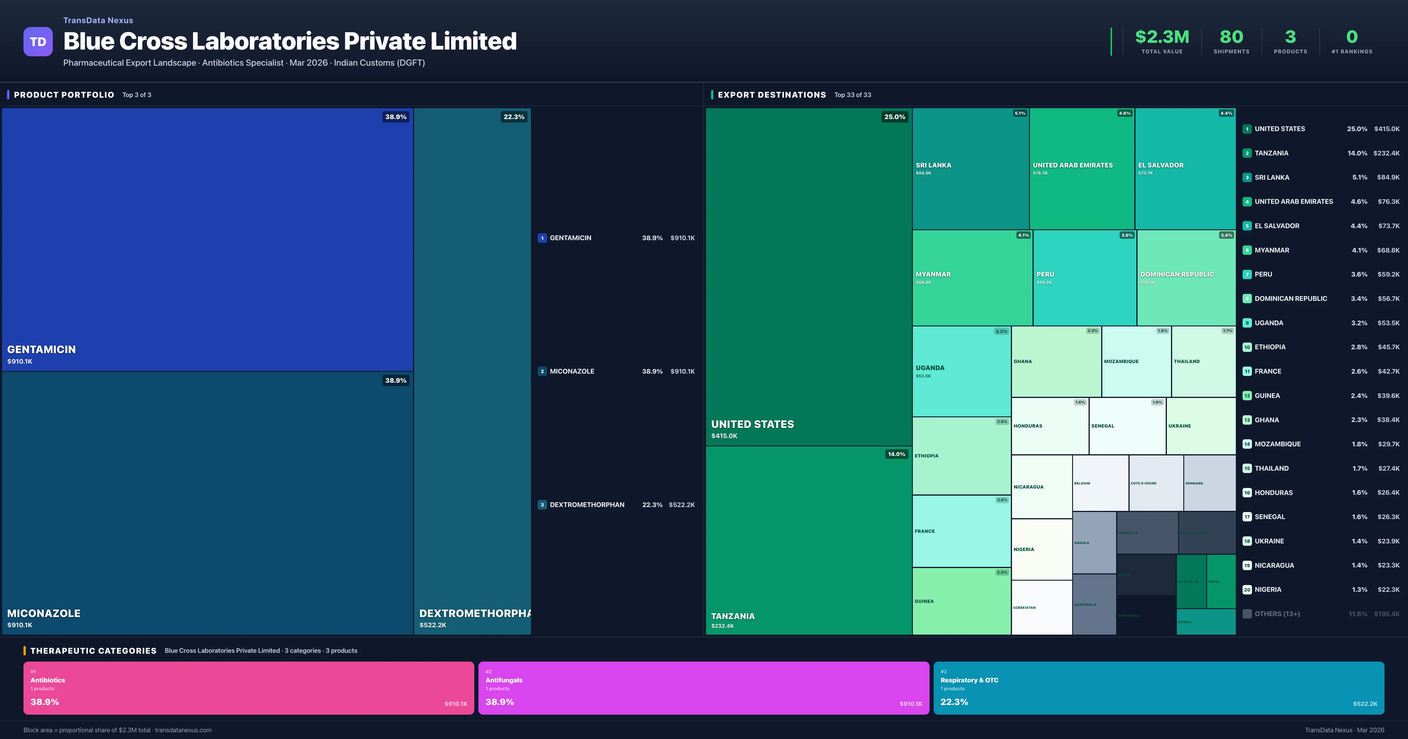 Blue Cross Laboratories Private Limited's total pharmaceutical export value is $2.3M, based on 80 verified shipments recorded in Indian Customs (DGFT) data.