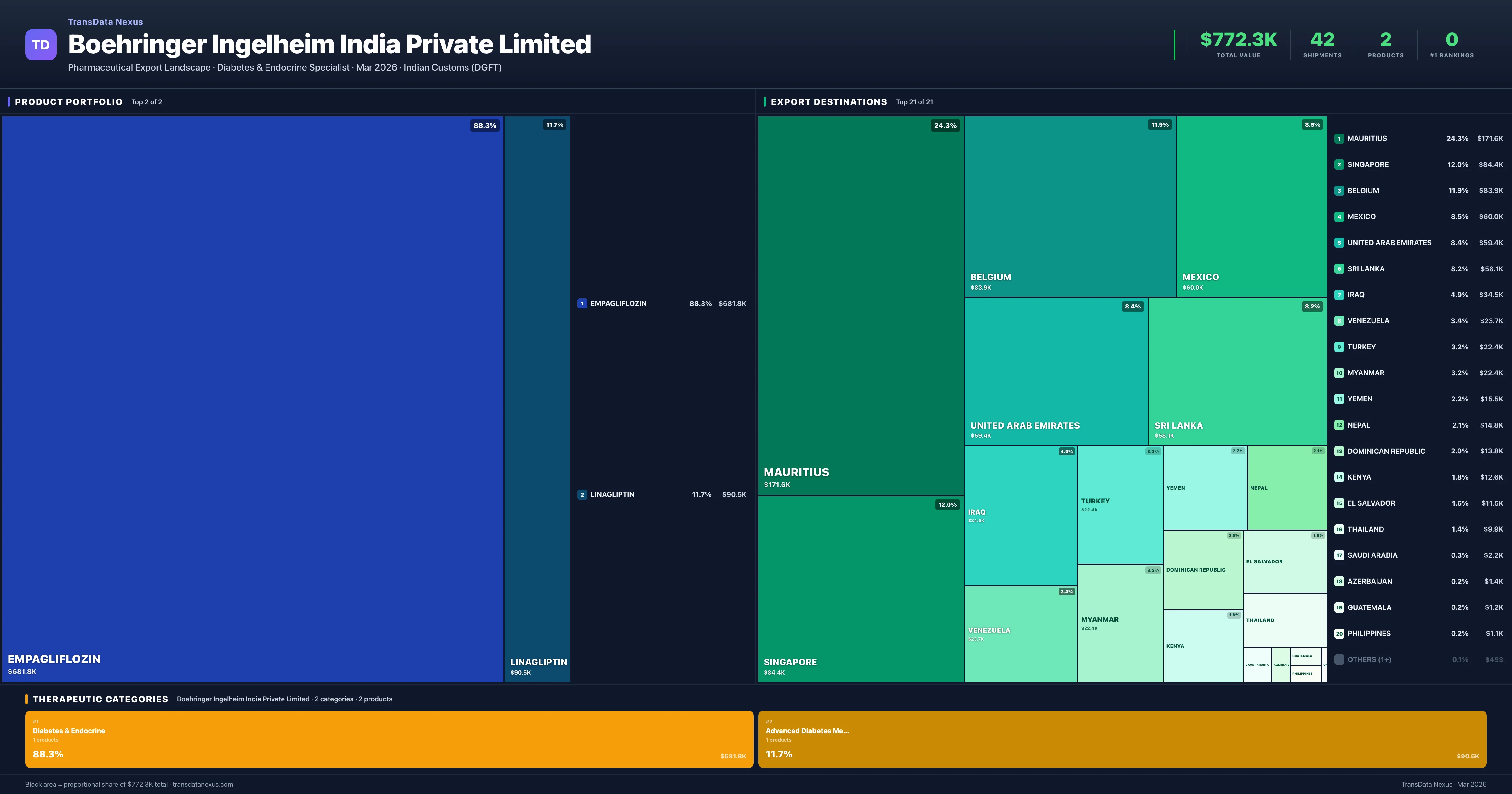 Boehringer Ingelheim India Private Limited exports 2 pharmaceutical products across 2 therapeutic categories. The top exports are Empagliflozin ($681.8K), Linagliptin ($90.5K). Total export value is $772.3K.
