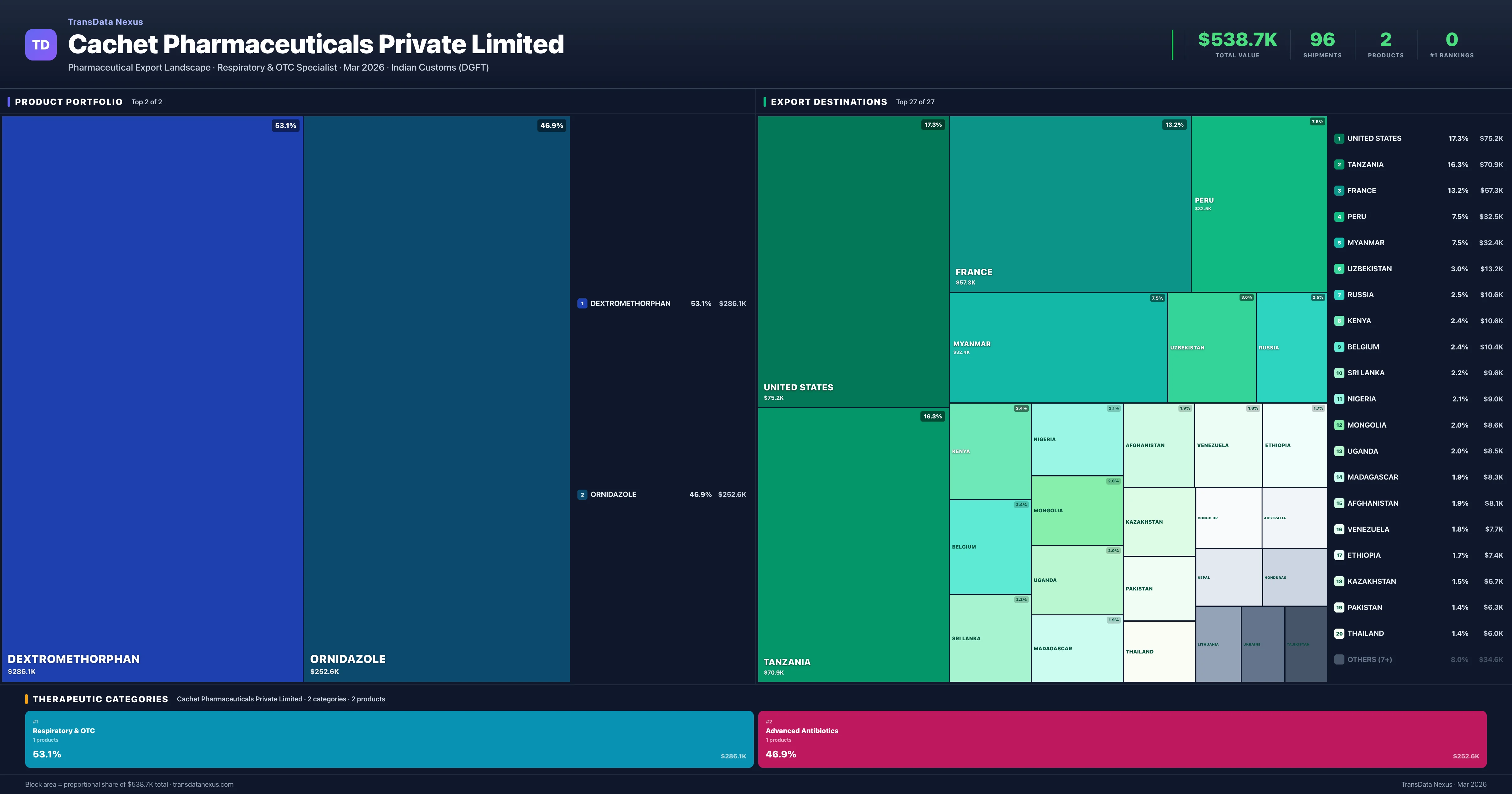 Cachet Pharmaceuticals Private Limited is an Indian pharmaceutical exporter with a total trade value of $538.7K across 2 products in 2 therapeutic categories. Based on 96 verified export shipments from Indian Customs (DGFT) records, the company actively competes across multiple product segments. Top exports include Dextromethorphan ($286.1K), Ornidazole ($252.6K), .