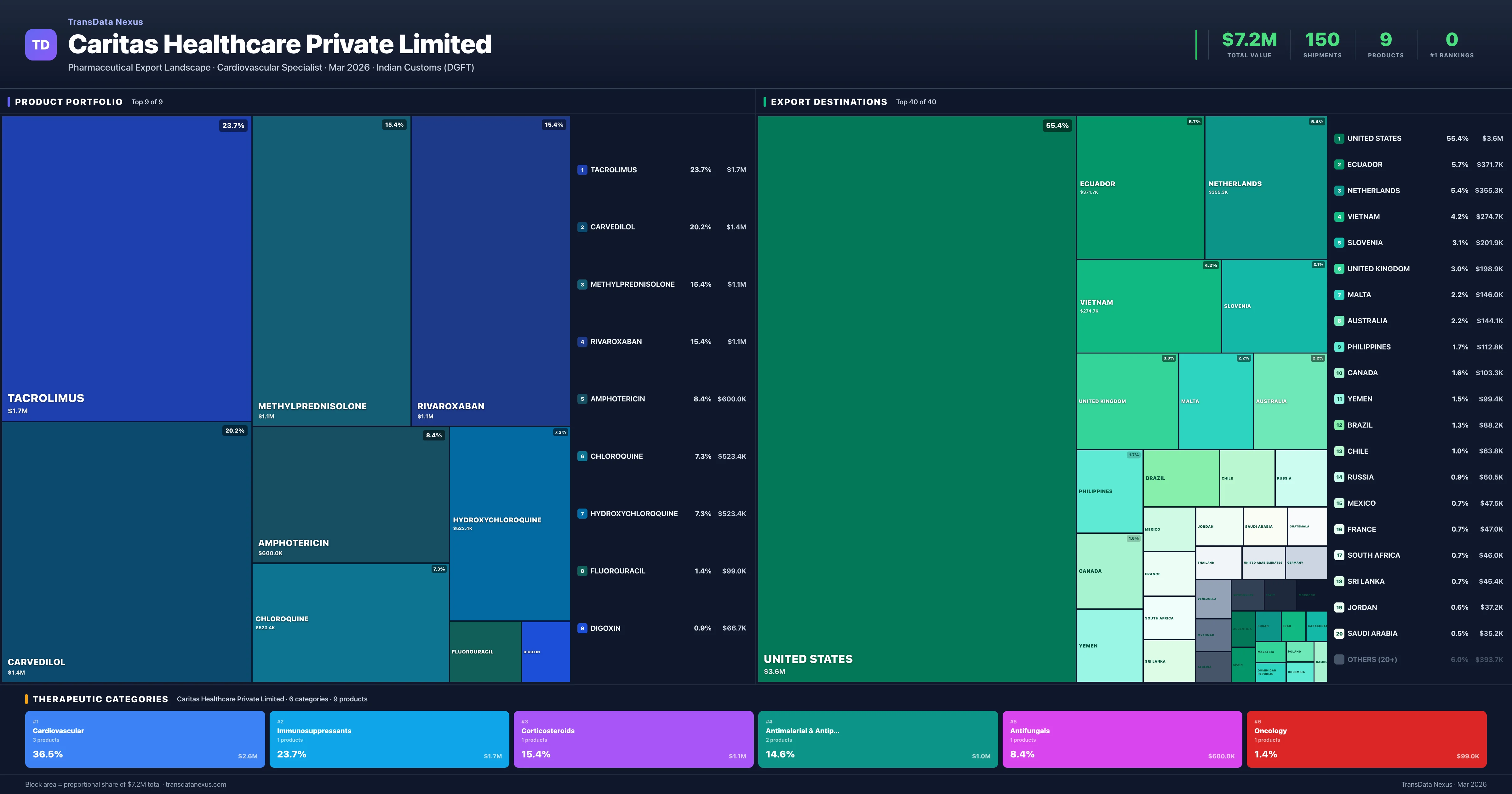 Caritas Healthcare Private Limited is an Indian pharmaceutical exporter with a total trade value of $7.2M across 9 products in 6 therapeutic categories. Based on 150 verified export shipments from Indian Customs (DGFT) records, the company actively competes across multiple product segments. Top exports include Tacrolimus ($1.7M), Carvedilol ($1.4M), Methylprednisolone ($1.1M).
