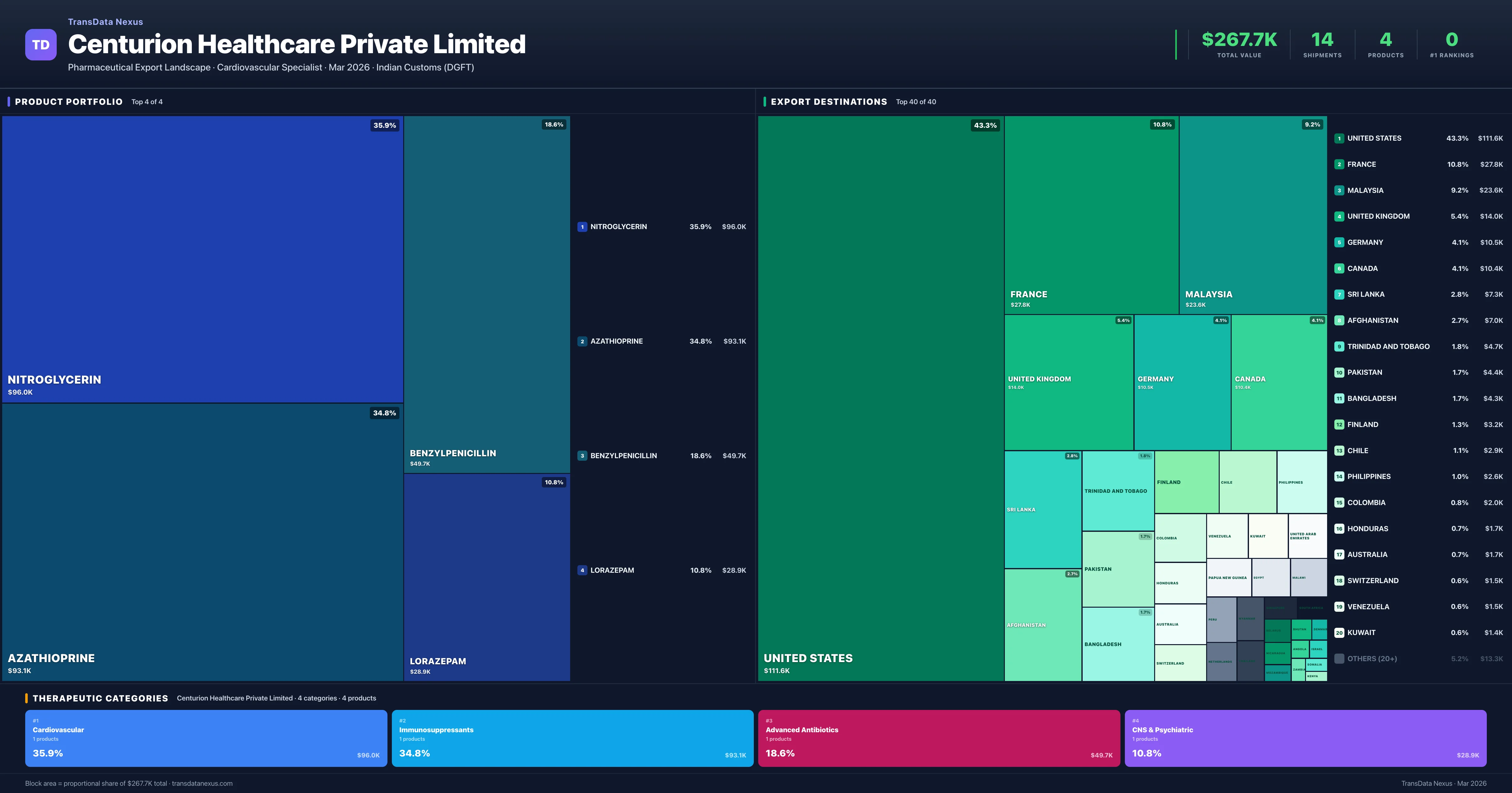 Centurion Healthcare Private Limited is an Indian pharmaceutical exporter with a total trade value of $267.7K across 4 products in 4 therapeutic categories. Based on 14 verified export shipments from Indian Customs (DGFT) records, the company actively competes across multiple product segments. Top exports include Nitroglycerin ($96.0K), Azathioprine ($93.1K), Benzylpenicillin ($49.7K).