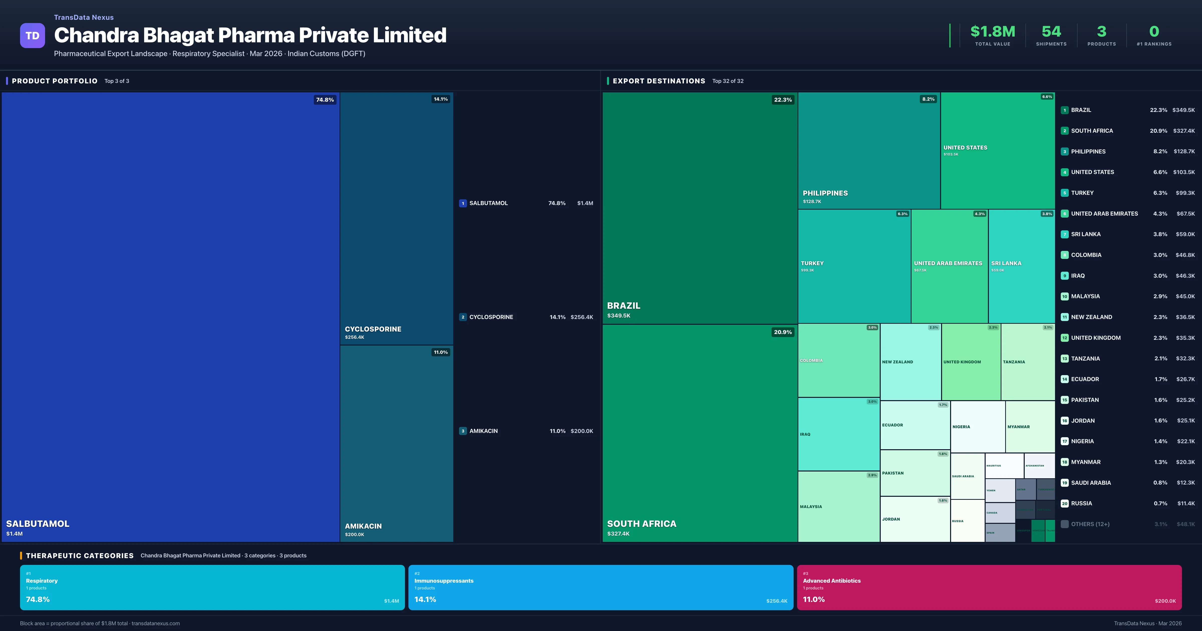 Chandra Bhagat Pharma Private Limited is an Indian pharmaceutical exporter with a total trade value of $1.8M across 3 products in 3 therapeutic categories. Based on 54 verified export shipments from Indian Customs (DGFT) records, the company actively competes across multiple product segments. Top exports include Salbutamol ($1.4M), Cyclosporine ($256.4K), Amikacin ($200.0K).