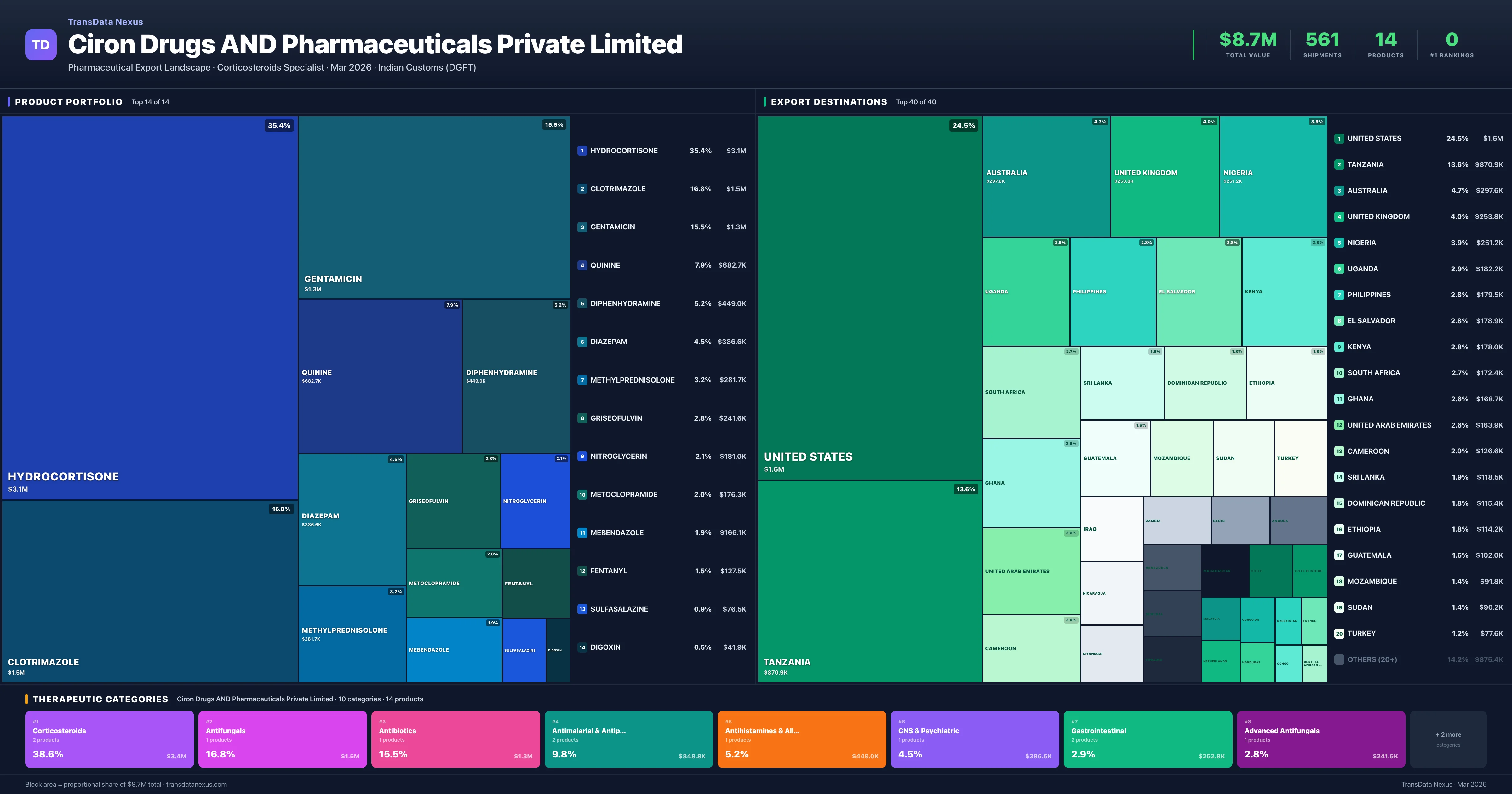 Ciron Drugs AND Pharmaceuticals Private Limited operates across 10 therapeutic categories, with Corticosteroids (38.6%), Antifungals (16.8%), Antibiotics (15.5%) representing the largest segments by export value. The portfolio is concentrated — the top 5 products account for 81% of total exports.