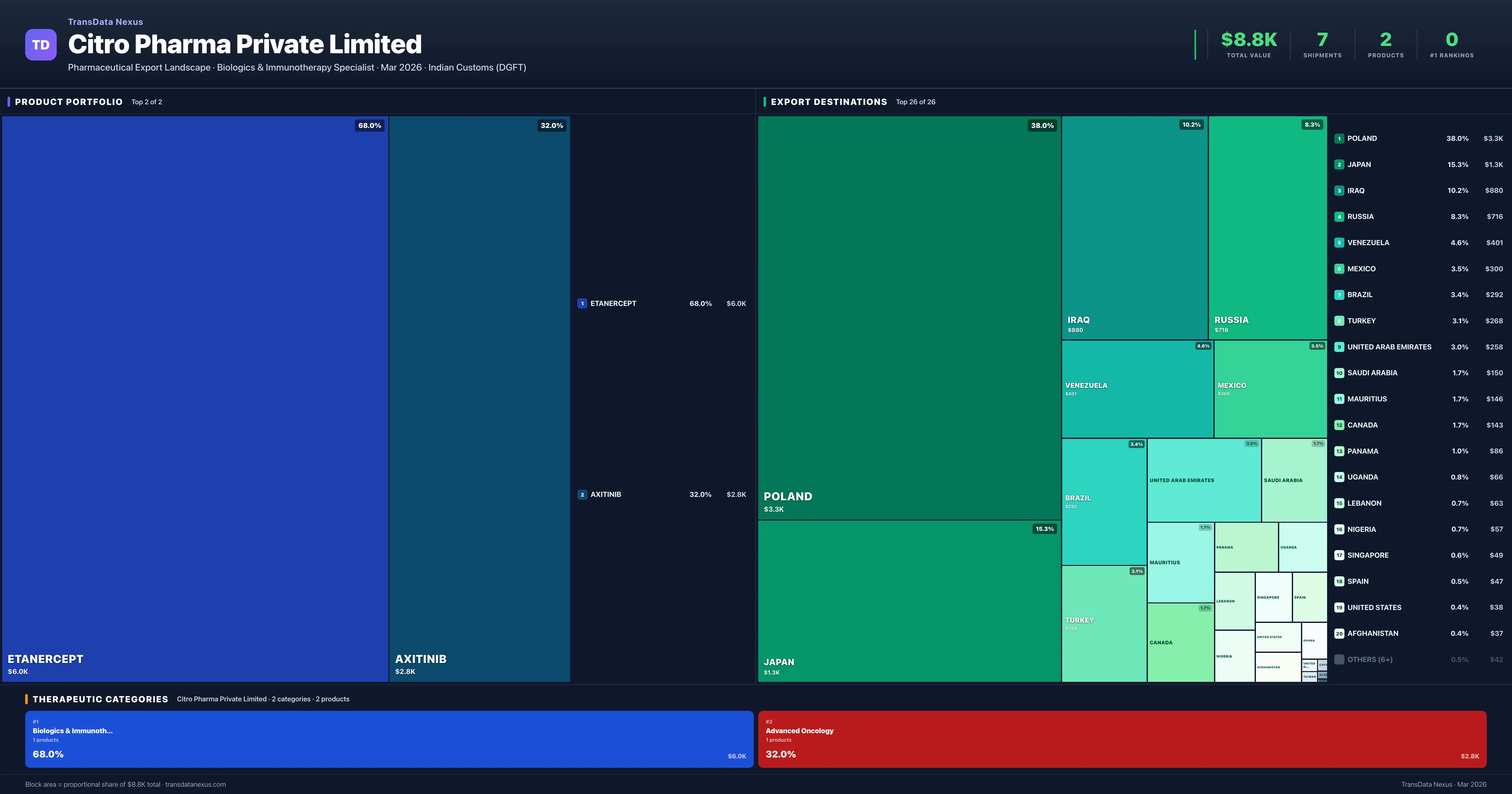 Citro Pharma Private Limited is an Indian pharmaceutical exporter with a total trade value of $8.8K across 2 products in 2 therapeutic categories. Based on 7 verified export shipments from Indian Customs (DGFT) records, the company actively competes across multiple product segments. Top exports include Etanercept ($6.0K), Axitinib ($2.8K), .