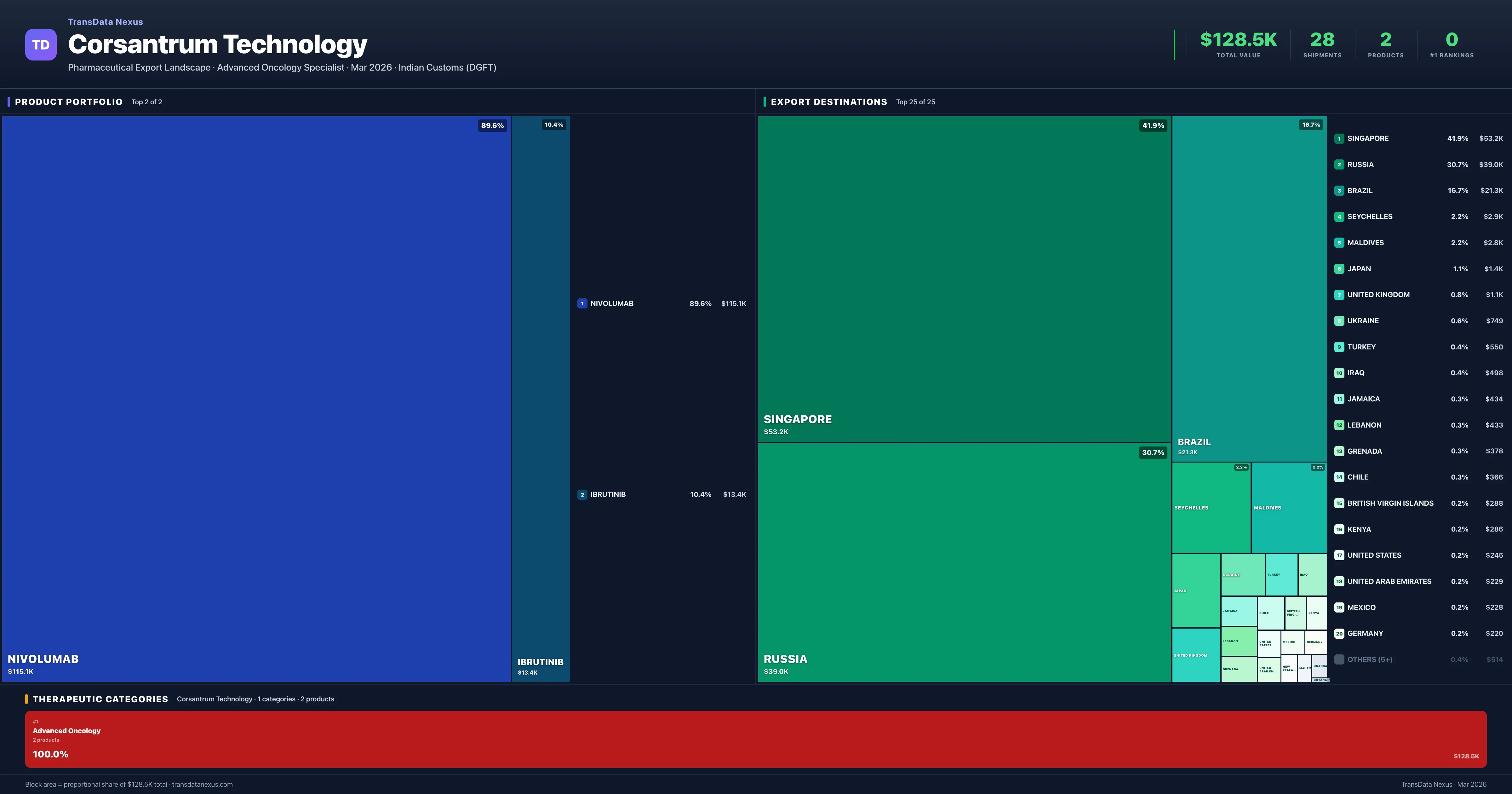 Corsantrum Technology is an Indian pharmaceutical exporter with a total trade value of $128.5K across 2 products in 1 therapeutic categories. Based on 28 verified export shipments from Indian Customs (DGFT) records, the company actively competes across multiple product segments. Top exports include Nivolumab ($115.1K), Ibrutinib ($13.4K), .