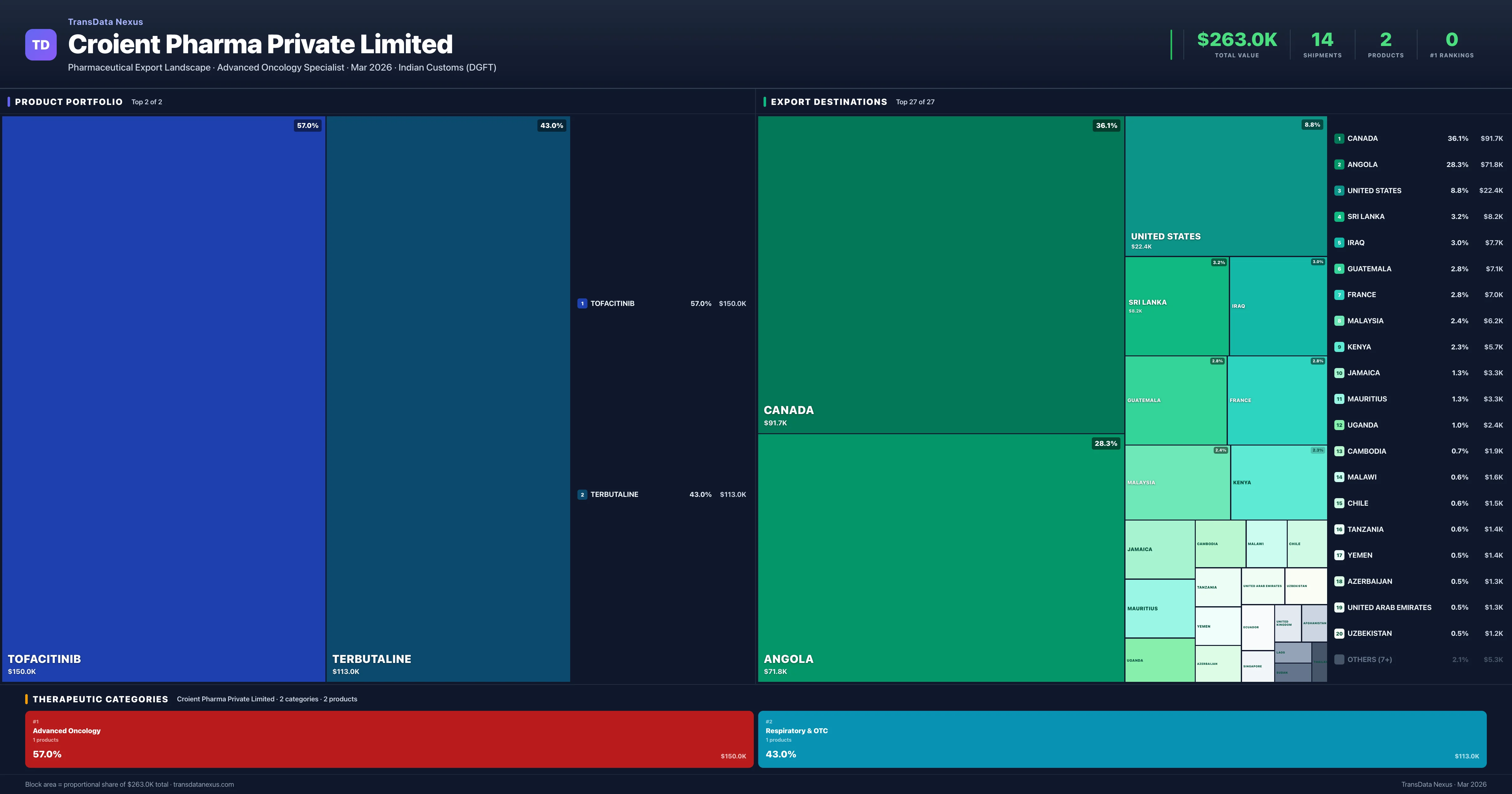 Croient Pharma Private Limited is an Indian pharmaceutical exporter with a total trade value of $263.0K across 2 products in 2 therapeutic categories. Based on 14 verified export shipments from Indian Customs (DGFT) records, the company actively competes across multiple product segments. Top exports include Tofacitinib ($150.0K), Terbutaline ($113.0K), .