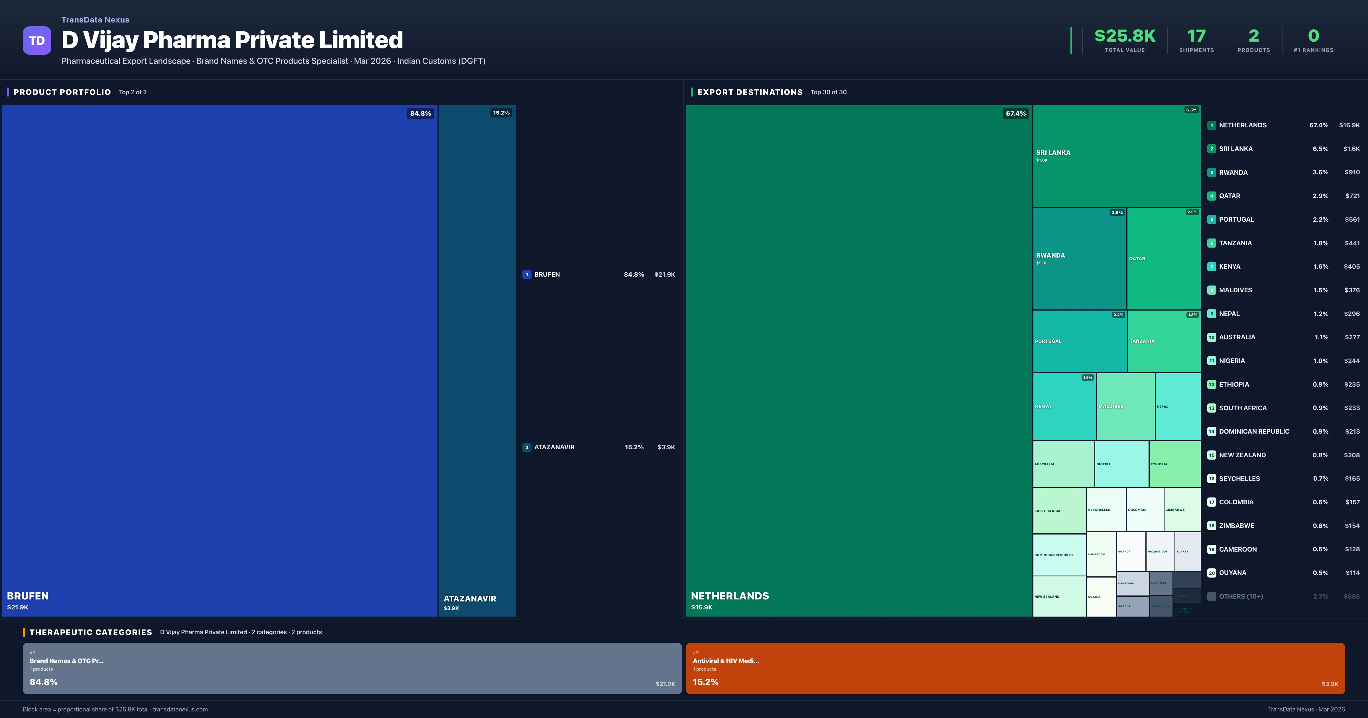 D Vijay Pharma Private Limited is an Indian pharmaceutical exporter with a total trade value of $25.8K across 2 products in 2 therapeutic categories. Based on 17 verified export shipments from Indian Customs (DGFT) records, the company actively competes across multiple product segments. Top exports include Brufen ($21.9K), Atazanavir ($3.9K), .