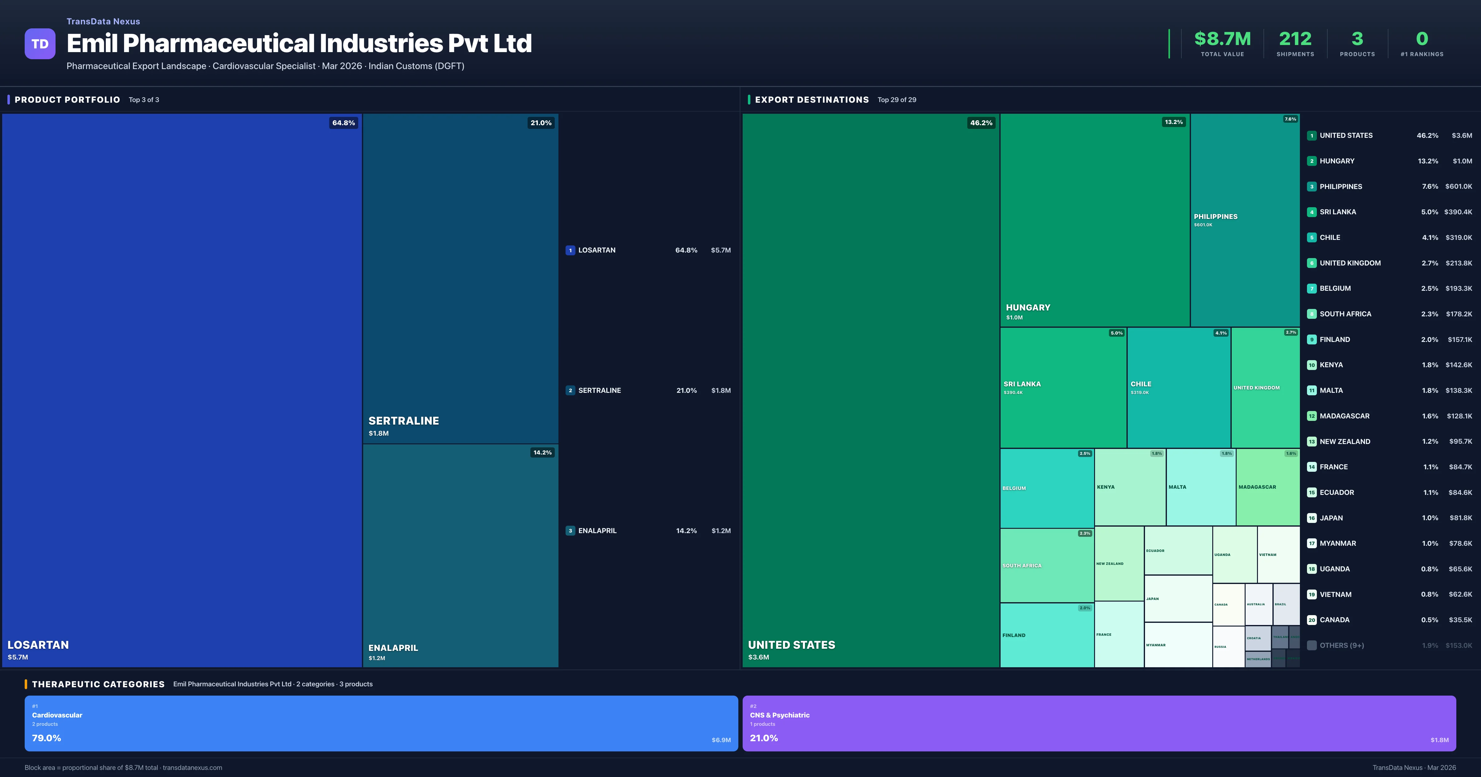Emil Pharmaceutical Industries Pvt Ltd exports 3 pharmaceutical products across 2 therapeutic categories. The top exports are Losartan ($5.7M), Sertraline ($1.8M), Enalapril ($1.2M). Total export value is $8.7M.