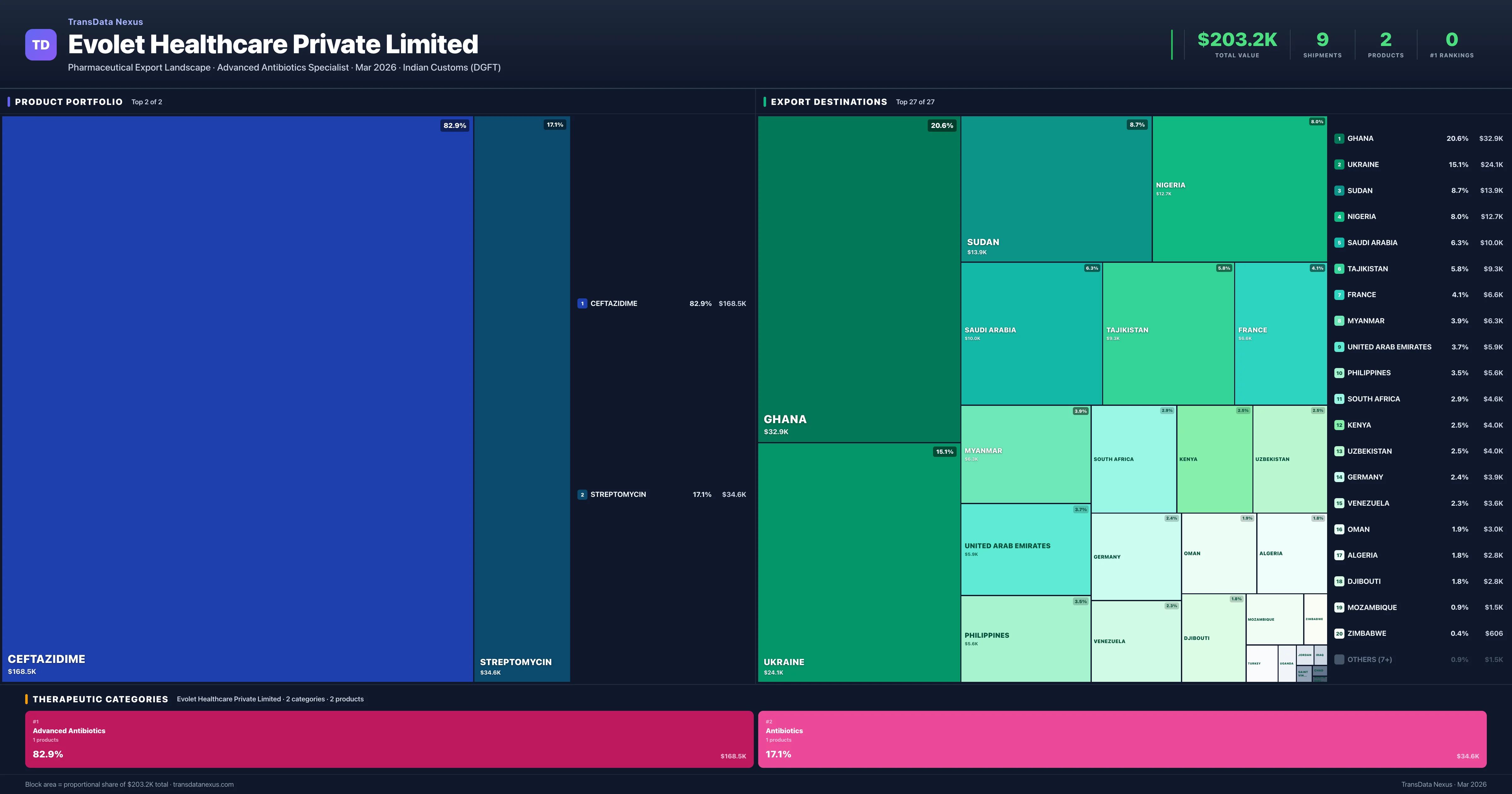 Evolet Healthcare Private Limited is an Indian pharmaceutical exporter with a total trade value of $203.2K across 2 products in 2 therapeutic categories. Based on 9 verified export shipments from Indian Customs (DGFT) records, the company actively competes across multiple product segments. Top exports include Ceftazidime ($168.5K), Streptomycin ($34.6K), .