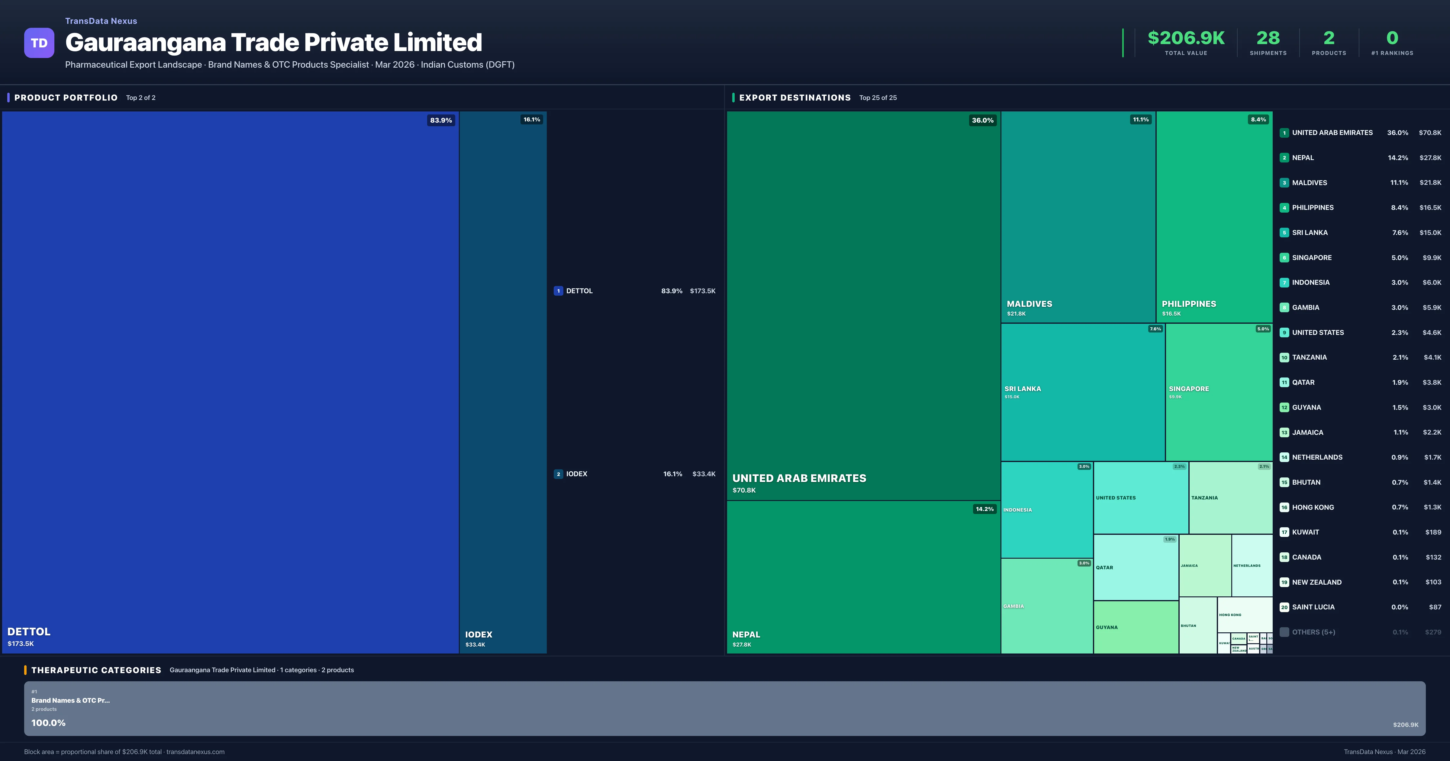 Gauraangana Trade Private Limited exports 2 pharmaceutical products across 1 therapeutic categories. The top exports are Dettol ($173.5K), Iodex ($33.4K). Total export value is $206.9K.