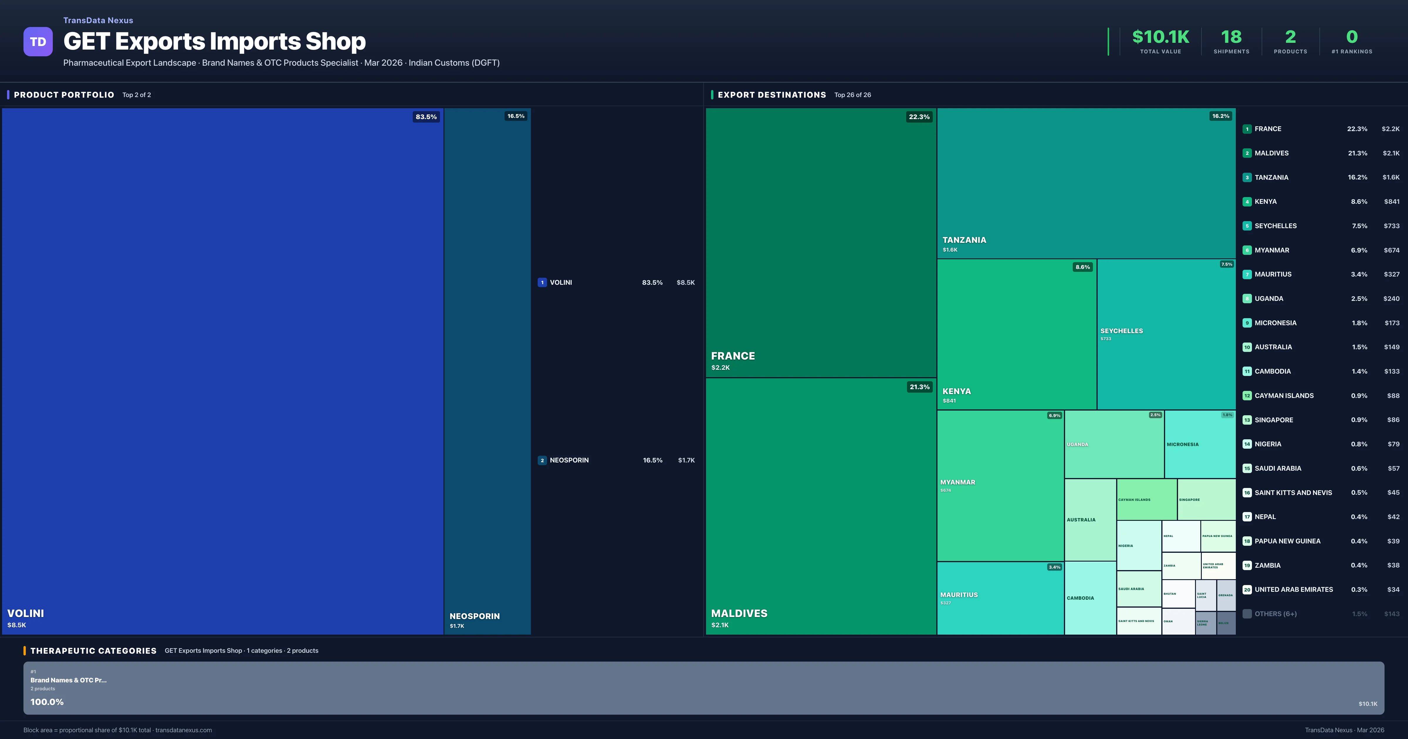 GET Exports & Imports Shop operates across 1 therapeutic categories, with Brand Names & OTC Products (100.0%), representing the largest segments by export value. The portfolio is concentrated — the top 5 products account for 100% of total exports.
