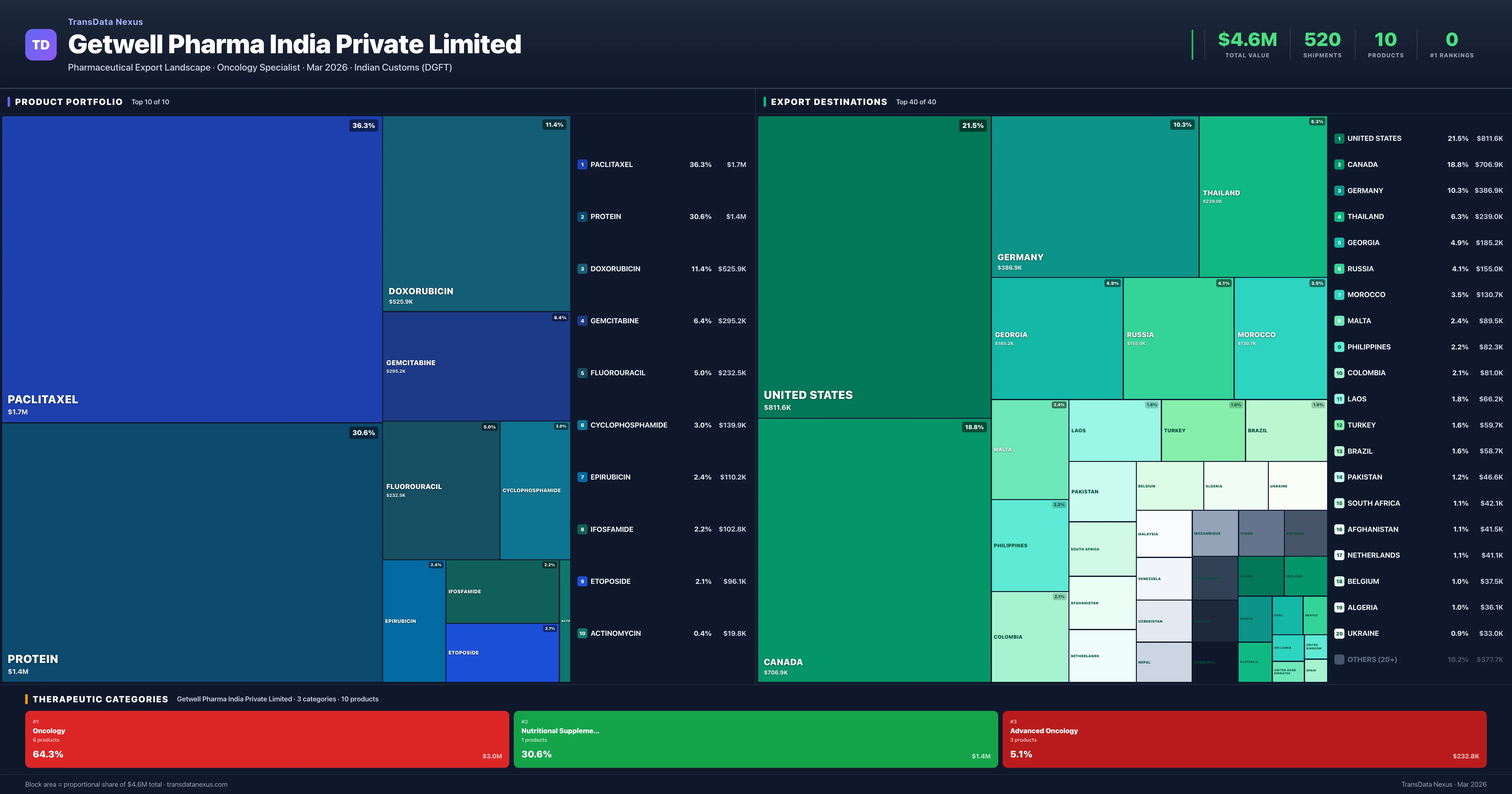 As of March 2026, Getwell Pharma India Private Limited has a total export value of $4.6 million USD, with 520 shipments across 10 products in 3 therapeutic categories. The company's product portfolio is heavily concentrated, with the top five products accounting for 89.8% of total exports. The primary therapeutic focus is oncology, comprising 64.3% of exports, followed by nutritional supplements at 30.6%, and advanced oncology at 5.1%.